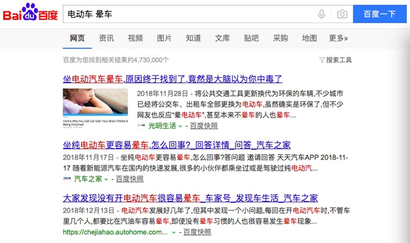 带着这个疑问我也在网上搜索了一下,结果出现400多万个“电动车晕车”的链接,看来坐电动车晕车并不是个例。所以我们今天就来聊一聊,为何很多人坐电动车会晕?