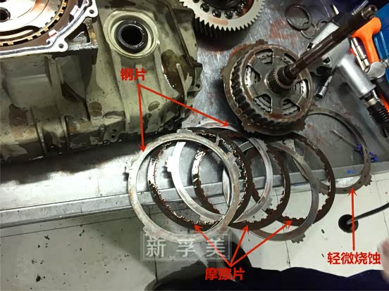 自动档变速箱里面每一个离合器组都有很多摩擦片和钢片,他们像汉堡包一样一张一张叠起来传递动力,里程数高了,表面发生了磨损剥落,离合器就会打滑。