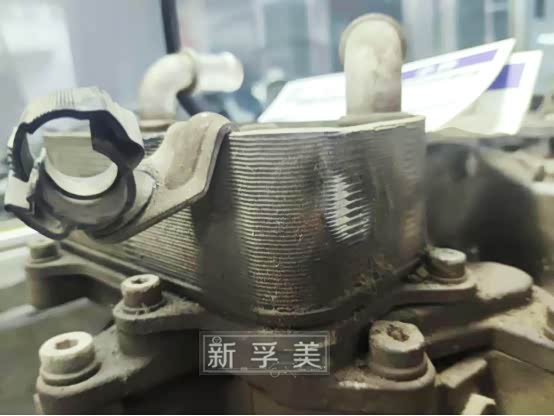 这是变速箱外部散热器,给变速箱起散热作用。如果您的爱车老是高温报警,您把水箱以及外部散热器都处理完还报,那么您可以处理这个部位了!切记,这变速箱散热器有俩个孔,一个连接防冻液,一个连接变速箱,很多爱信09G变速箱都因为疏忽导致防冻液进变速箱,大家定要注意!