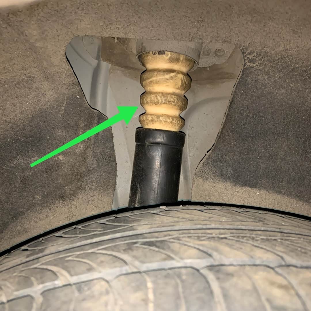 两个下支臂衬套安装之后,师傅又更换了两后轮减震器的缓冲块,这两个缓冲块的作用是保护减震器不被压缩到极限,延长减震器的使用寿命。下图箭头所示,这是换下的一个旧缓冲块,已经掉落一部分。