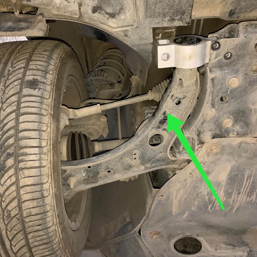 下图所示,这是左侧下支臂衬套的安装位置,把固定螺丝安装好就可以,下支臂球头以及另一个小胶套没有问题。