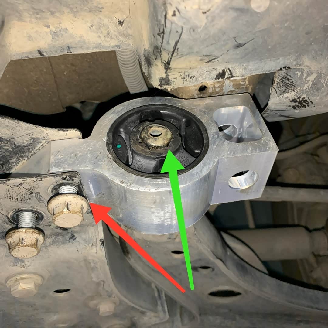 下图所示,师傅正在安装右侧新衬套。绿色箭头所示,下支臂的一端在衬套中心安装,有固定的位置。橙色箭头所示,两条螺丝连接副车架到车身,衬套另一端的一条螺丝直接固定衬套在车身。