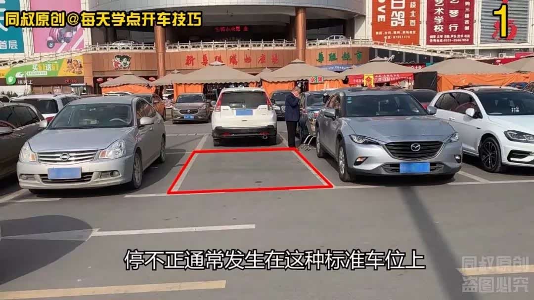 停不正,通常发生在这种标准车位上,因为车位宽度标准,停车不会那么拥挤,左右车辆在停车时就比较随意,像这个车位,车位左边的这辆轿车基本在中间但是它的车身是摆斜的,车头靠右而车尾靠左,右边这辆轿车虽然停的比较直,但是它整个车身靠右边,给左边留的空间比较大。多数情况下,我们在倒库时都会参照左右车辆,如果左右车辆停的本身就不正、不标准,那在这种情况下你的参照物不标准,最后你停车也可能不标准。