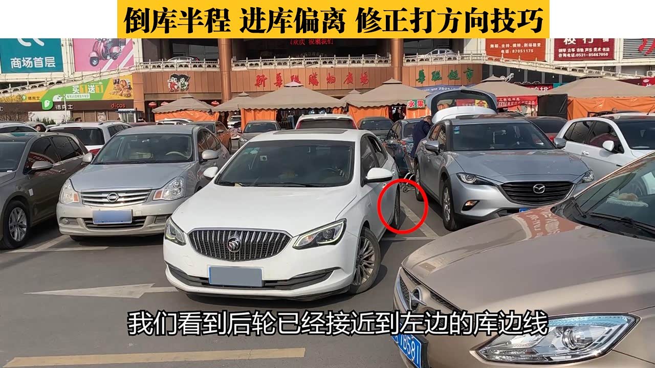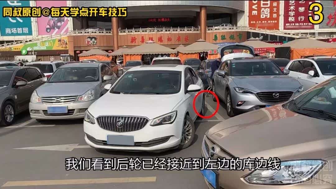 可能是因为过道上有车辆和行人不停的通过,给停车带来了干扰,也可能是右侧车辆停的太靠右,在把它作为参照时去掉了提前量,我们看到后轮已经接近到左边的库边线,因为车身还没有顺直,需要在向右打满方向状态下继续倒车,