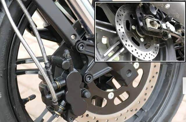 安全制动上,前刹车是直径为280mm单碟刹盘匹配了单向三活塞卡钳,后刹车的直径为240mm的碟刹盘匹配单活塞卡钳,没有搭配ABS,配备的是一个比较常规的CBS (前后刹车联动系统)。