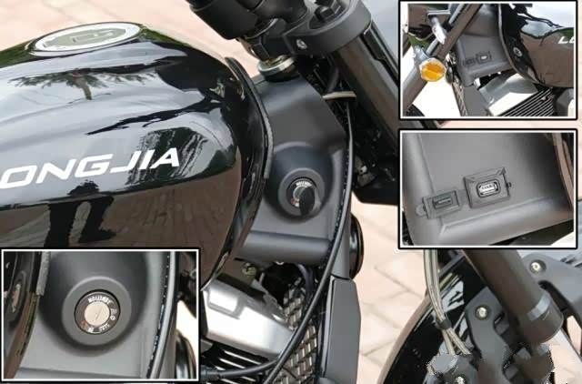 在外观方面,龙嘉V途250在外观上充分采用了十分经典的美式风格,并且整车设计混合了cafe和街车的风格。油箱采用了棱角设计,比水滴形油箱要年轻化一些。另外,这款车的钥匙门设计在车身右侧,风格完全依照了美式机车,车身侧面还搭配了USB充电接口,日常充电比较方便。