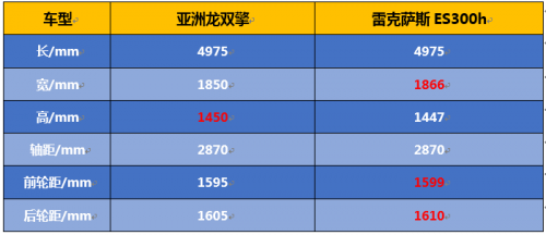除了同样的动力总成,亚洲龙2.5L双擎版的车身尺寸与雷克萨斯ES300h也极为相似。如下图所示,两车轴距相同,雷克萨斯ES在宽度等方面占了小小的优势,而在高度上亚洲龙却稍占上风,总的来说相差甚微。不过值得一提的是,雷克萨斯ES定位C级车,亚洲龙仅为B+级车,因此亚洲龙能有这样的空间表现非常不错。