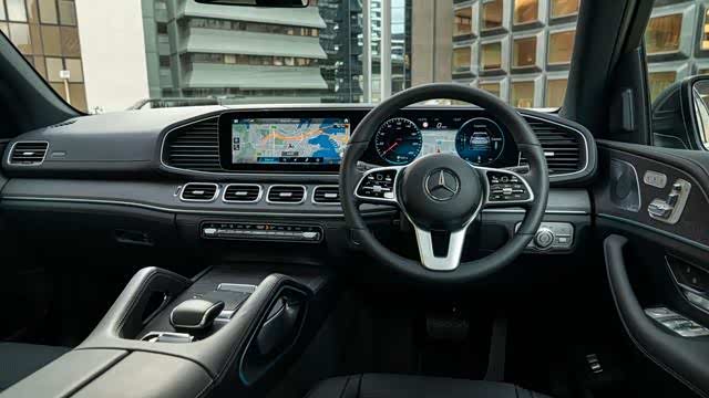 2020年款奔驰GLE的内部,看起来和感觉比老款的按钮布局先进了两代。两个并排的12.3英寸屏幕使用MBUX操作系统,通过触摸屏、方向盘触控板或语音识别来控制。从驾驶座上你可以看到一个可配置的数字仪表组,它可以显示包括地图在内的所有功能,所有功能都由方向盘右侧辐条上的触摸板控制。在仪表盘上面有一个大的突出的HUD显示器,显示你的速度,速度限制和导航指令。