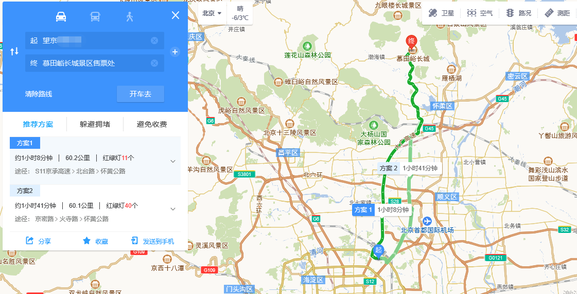 下图这是我们行车的路线,从望京某小区到慕田峪长城,单程60多km,往返就需要120km,中间还要爬坡、还要开暖风、还要上高速地板油……我真不敢想象回来还剩多少续航。啊!愿上帝保佑我们……