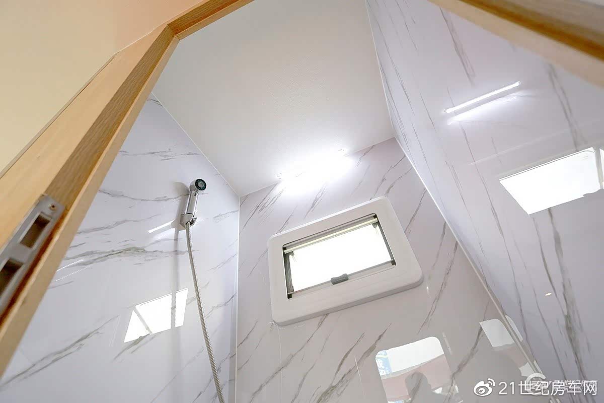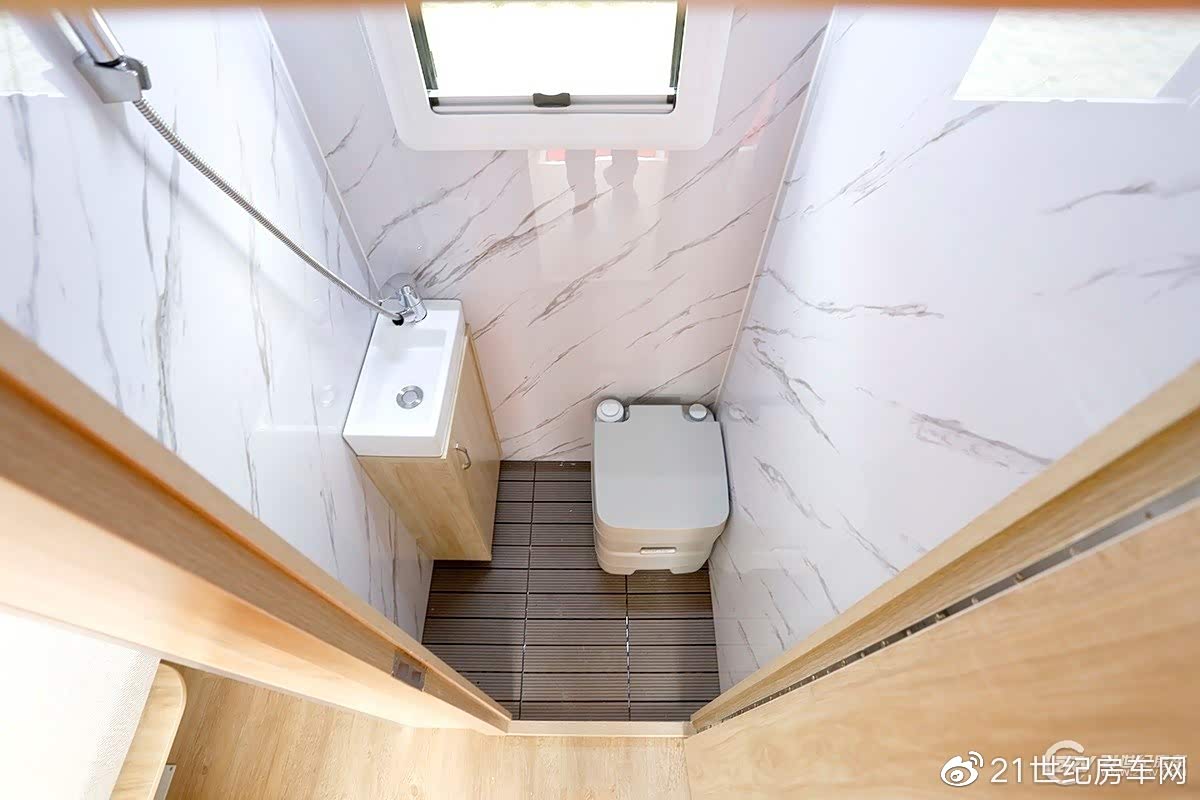 厨房位于车厢中部,配备不锈钢洗手池等,对面配有102L车载冰箱及多组储物柜等;卫生间采用干湿一体式设计,内部配备便携式座便器,洗手池,抽拉式一体式淋浴花洒等。水路系统方面,净水箱容积为100升。