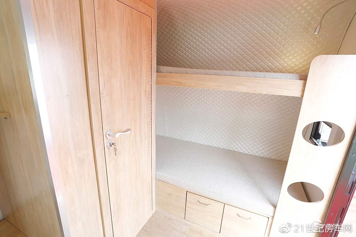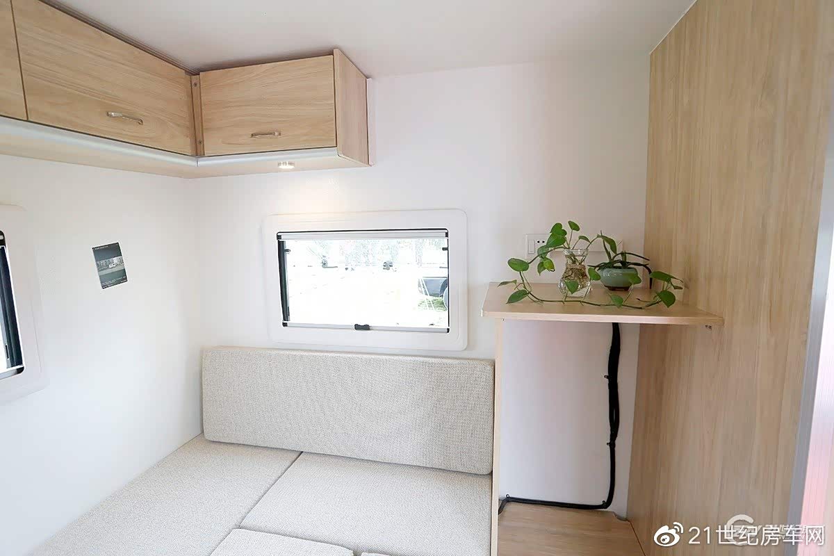 整体空间布局紧凑,室内板材采用原木材质,色调偏暖色系,给人一种温馨的感觉。车厢前部采用上下床卧铺设计,车尾部分是一张大U型沙发,也可以转换成一张尺寸为2140×1300(mm)的双人床。车内配置可以根据用户需求进行加装;可以基本满足2-4人(2大人2小孩)的正常睡眠需求。