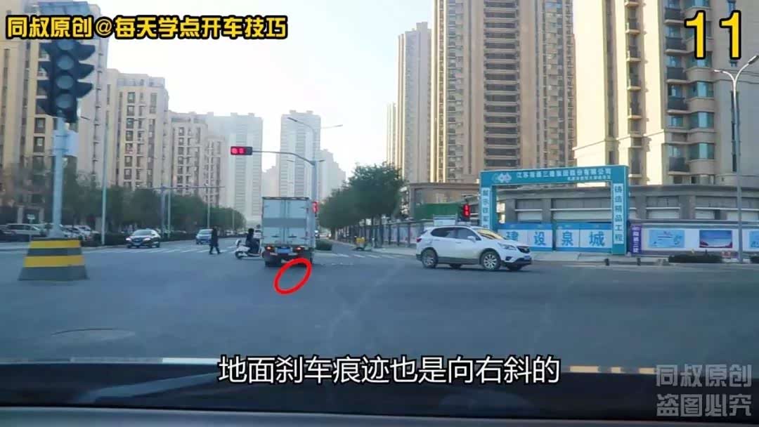 开回来后在这个角度可以看得出,厢卡车身向右摆斜一点,地面刹车痕迹也是向右斜的,无法判断当时它的动机,也许这辆厢卡打算过路口去往这个非机动车道,也许当时厢卡左前方有障碍物,这个需要调监控才能看到当时的场景,SUV的右侧后门被撞的凹了进去,根据刹车痕迹判断发生撞击后厢卡原地停车,SUV在前进了两米多后才停下的车。