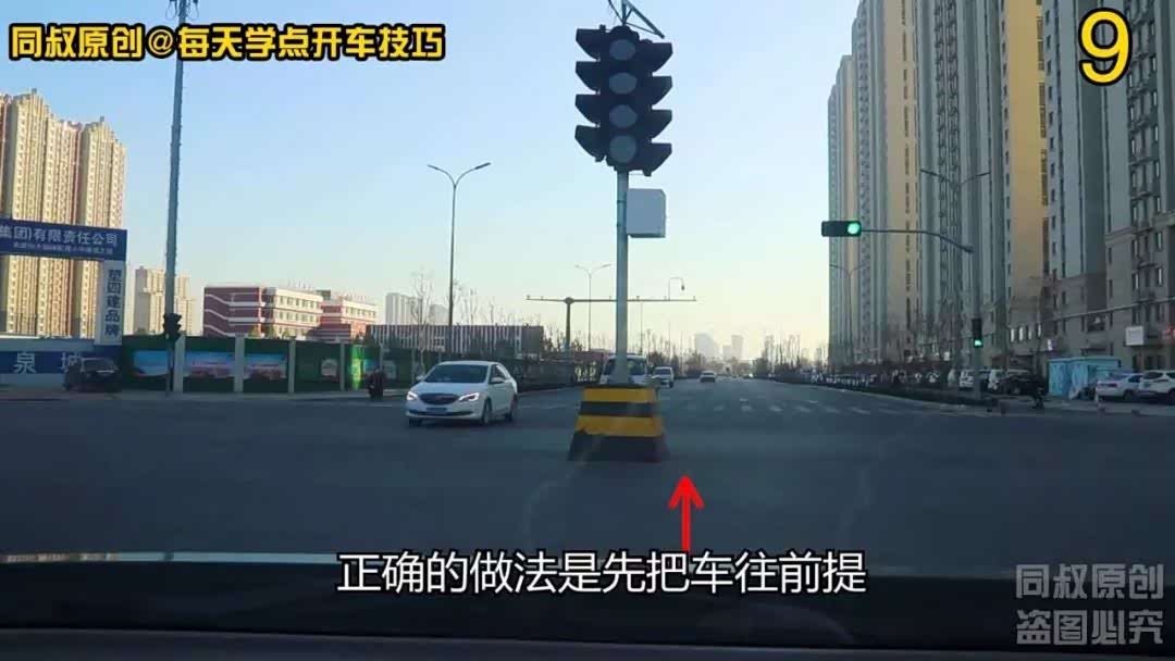 第三个场景告诉了我们,作为左转车辆一方要主动让行,让行的停车位置有讲究。往前提车不越过左边的中心线虚拟延伸线,即便是越过也不能影响对向车道行驶;往前提车的好处还有,就是不影响后面直行车辆通行,因为这个是左转加直行车道。