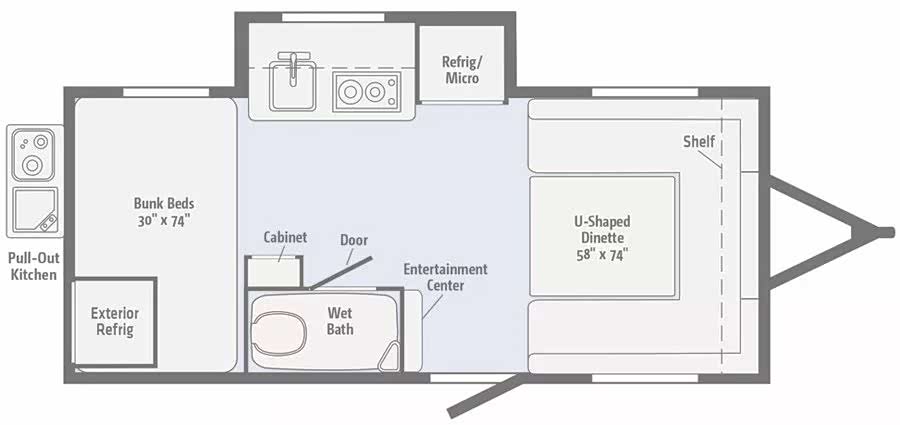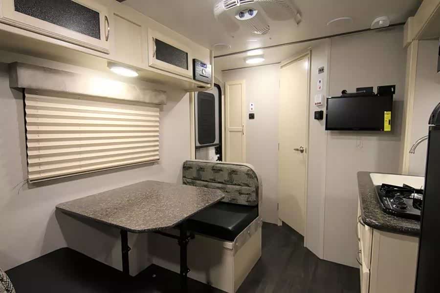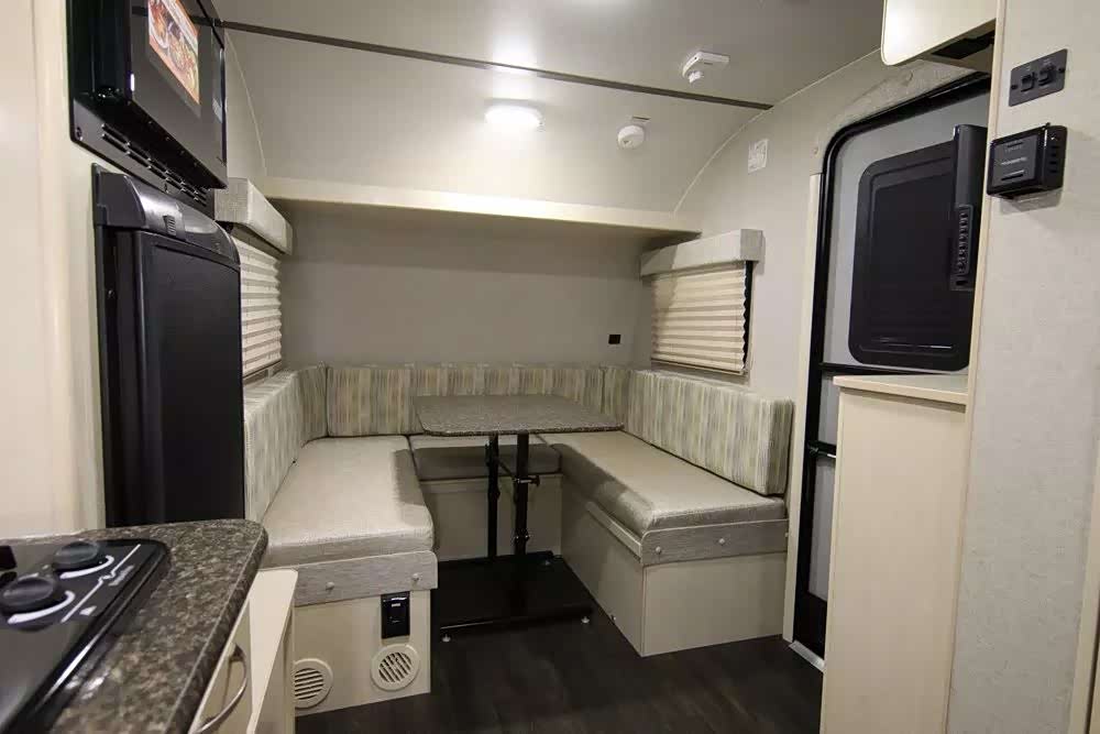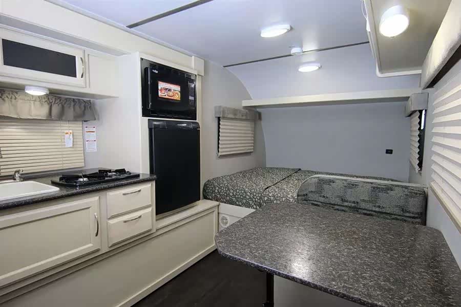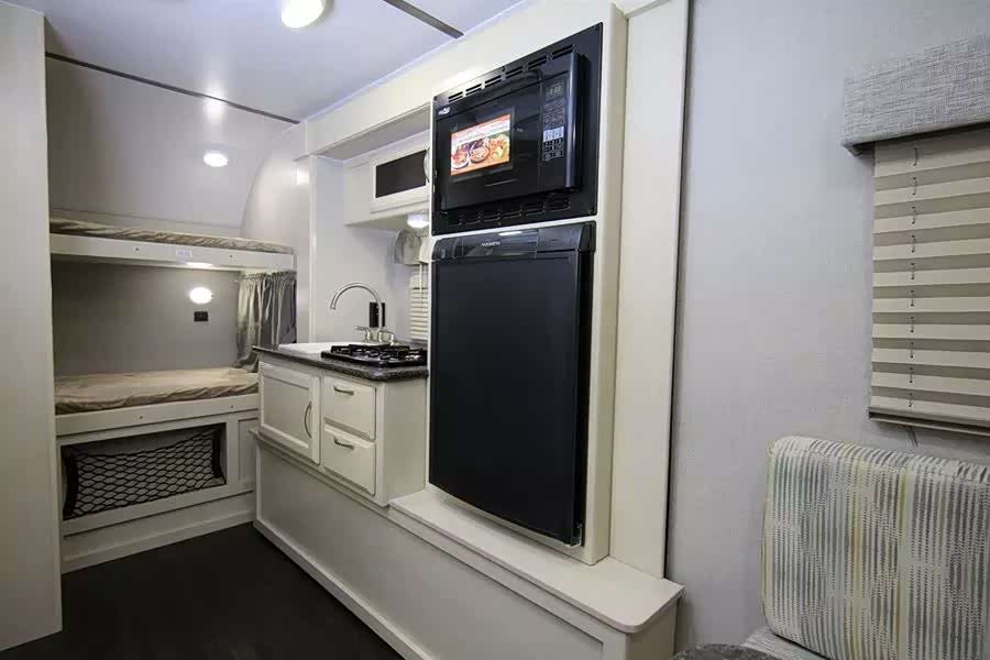 车内布局和我们常见的国内拖挂房车布局有所不同,卡座设计在车门一侧,厨房配有微波炉、118L冰箱、双芯燃气灶、水槽等设施。