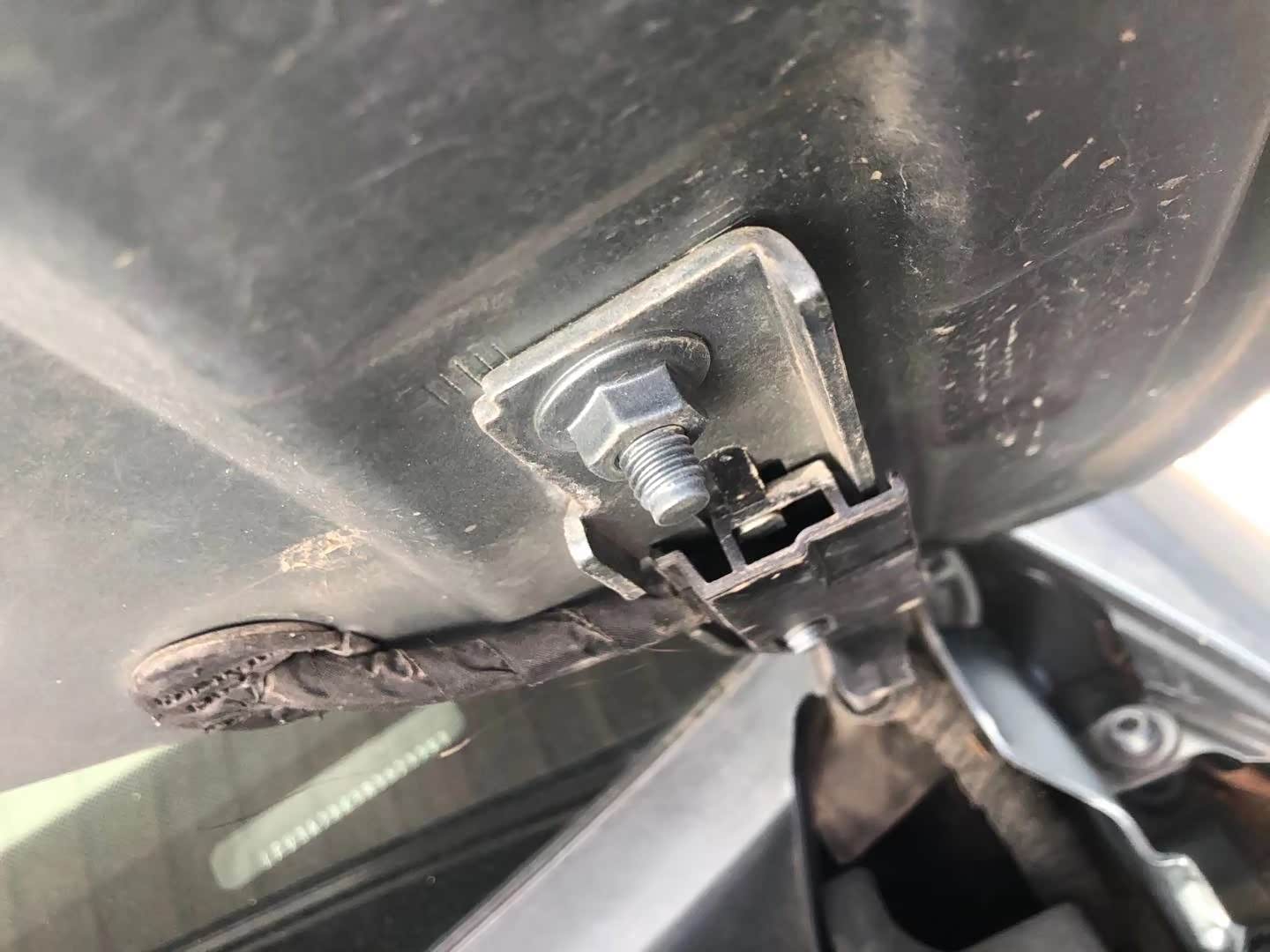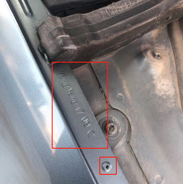 首先来看右前叶子板的螺丝,发现螺丝有拆卸,而且铆钉也是重新锚的,并且还有生产厂商以及生产日期,看来右前叶子板一定是换过了的,好在叶子板梁并未伤到。