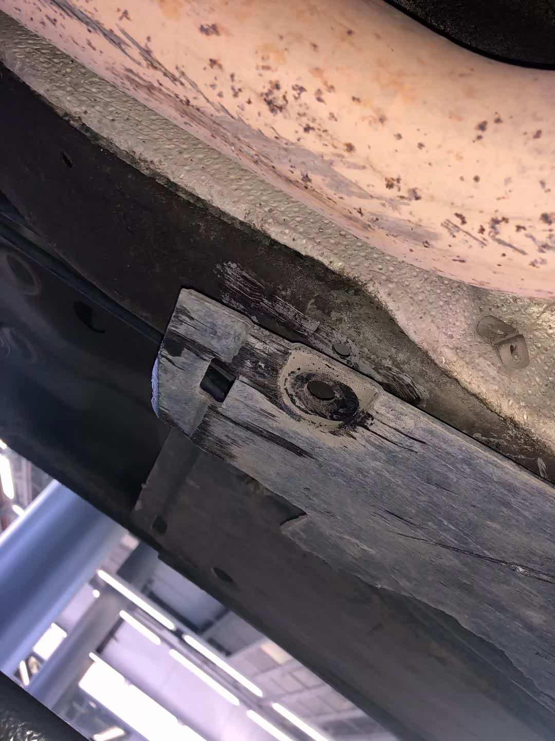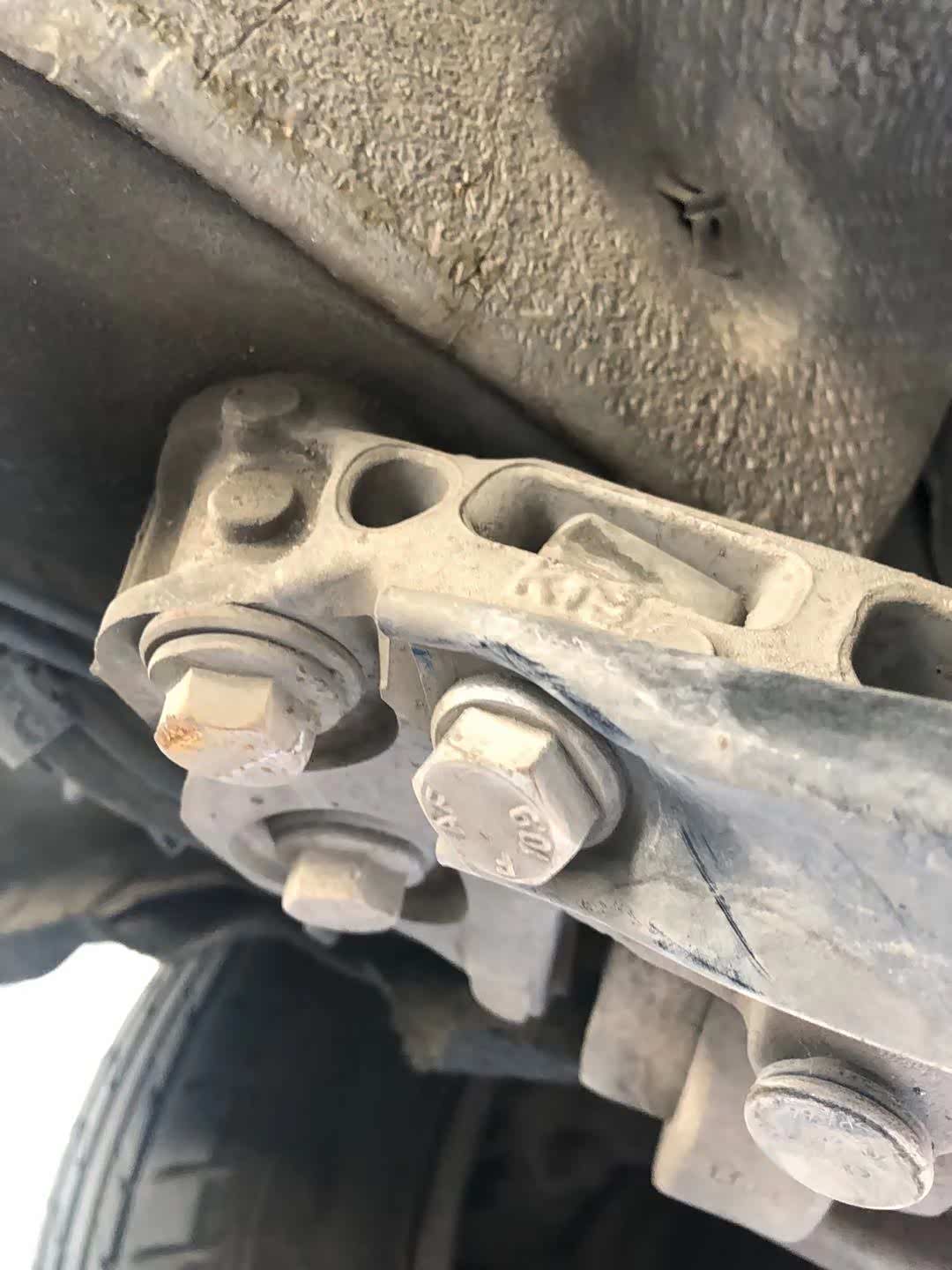 包括元宝梁下加强筋的螺丝均不存在拆卸的痕迹,确定了元宝梁无拆卸现象,也就进一步确定发动机和变速箱为原厂。因为拆卸发动机变速箱是必须要对元宝梁进行拆卸的。