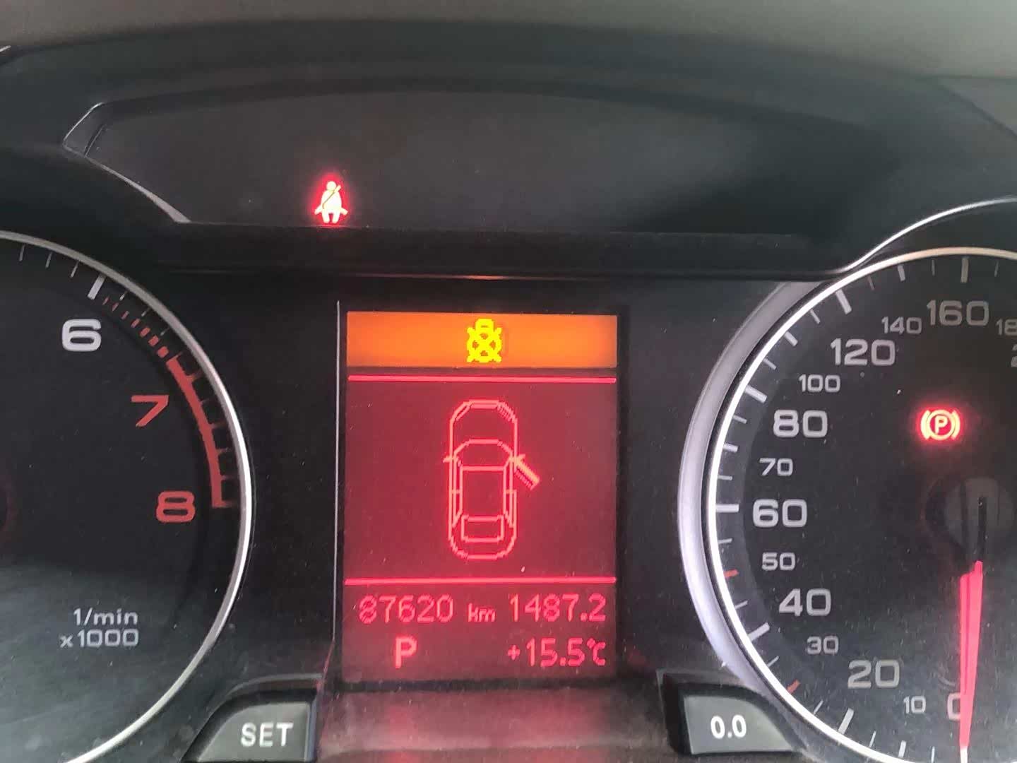 仪表盘显示内容全面,基本信息一目了然。目前表显是87620公里,结合内饰、轮胎和刹车盘片的磨损情况来看,可以排除存在大里程的调表可能。仪表上部有一个提示灯亮起,这是灯光故障提示灯,经检查有一个制动灯不亮,到时候换一个就OK。