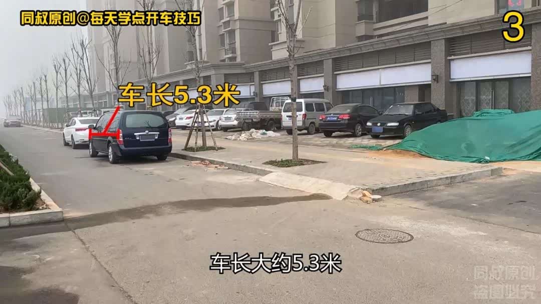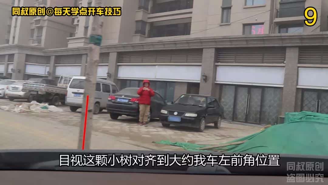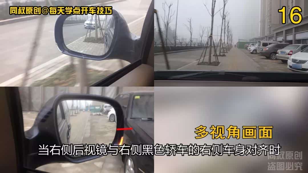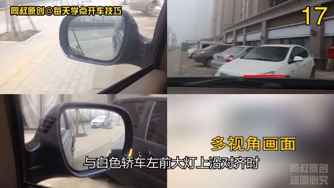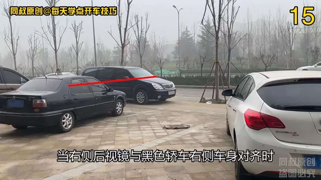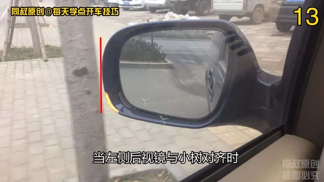 左侧后视镜大约与左侧两厢车的后轮对齐,此时前后和左右距离都基本合适了。