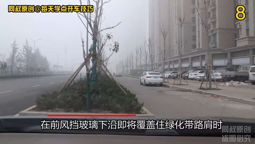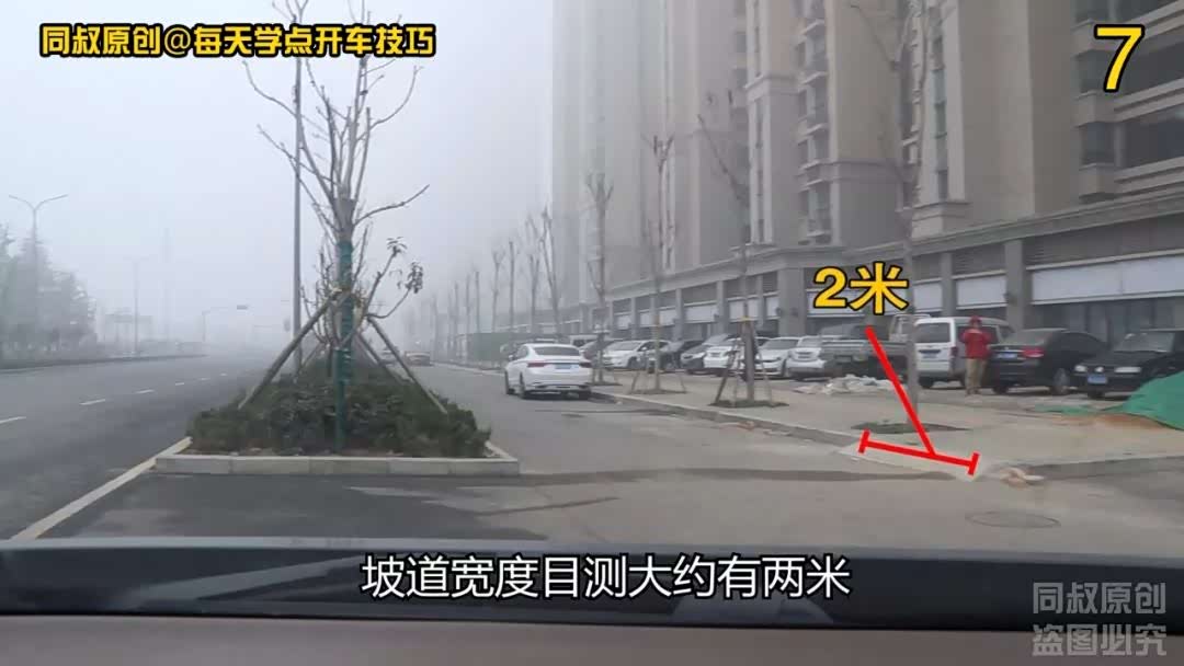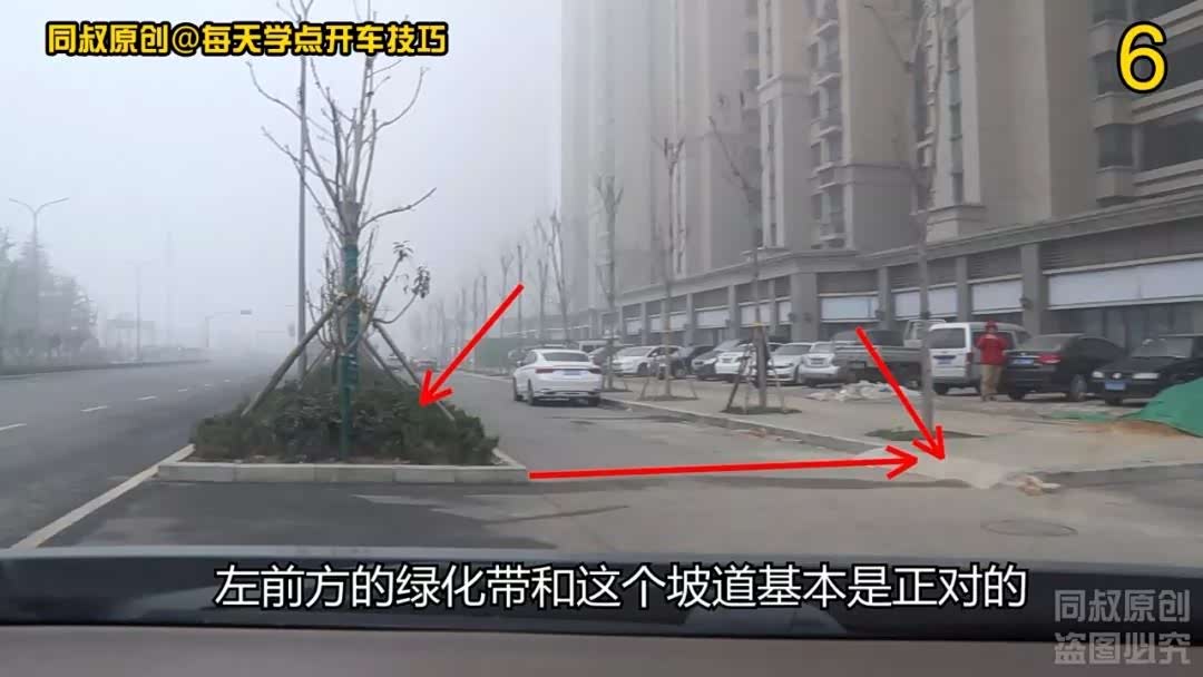 把车停在稍微远一点的位置,在车内可以观察到前面的整体路况,左前方的绿化带和这个坡道基本是正对的,