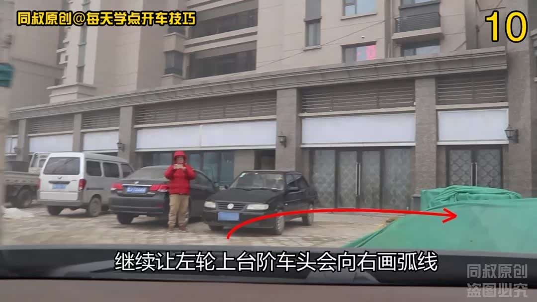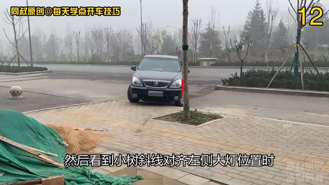 此时虽然两只前轮都已经上了台阶,在左侧车窗外刚刚看到小树,后视镜距离小树还有一段距离,现在还不能立即往左拐,先向右打一下方向让身与小小树尽量拉大距离,当左侧后视镜与小树对齐时,向左打满方向,