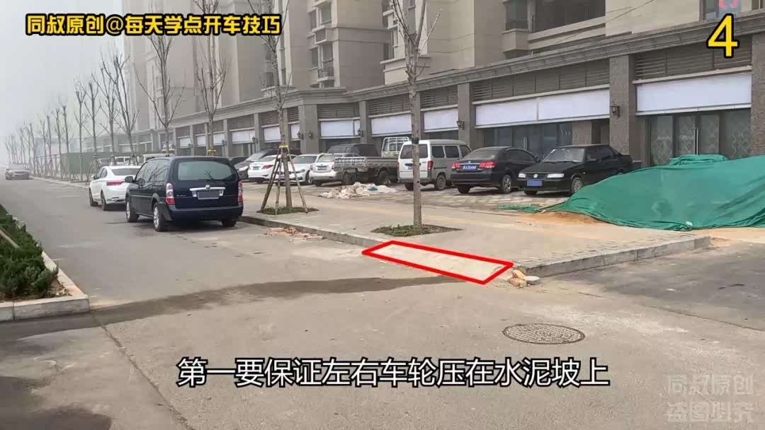 我一会打算把车从这里开上去,到前面找车位停车,等会操作时,第一要保证左右车轮压在水泥坡上;
