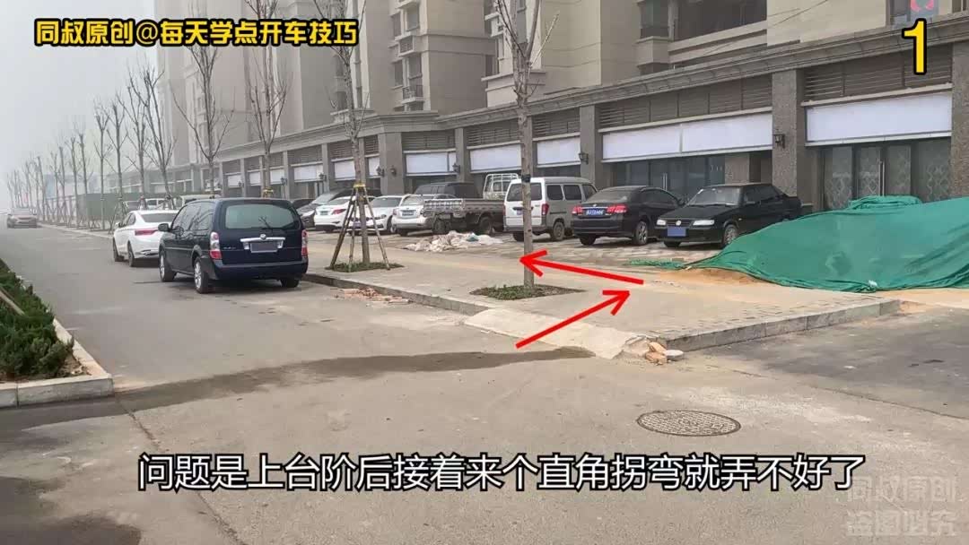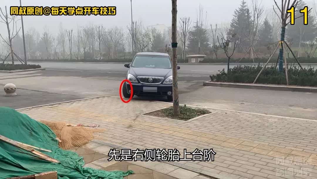 然后看到小树斜线对齐左侧大灯位置时左侧轮胎也上到了台阶上。