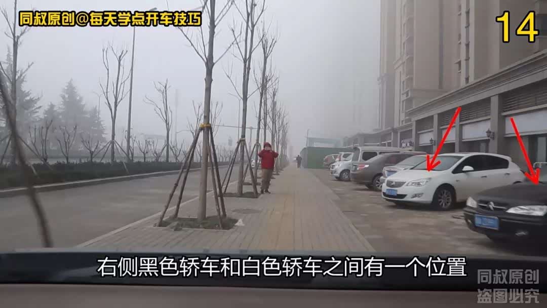 外景可以看到车头左前角与白色轿车擦肩而过,当车身与两侧车辆车身平行时回正方向停车。