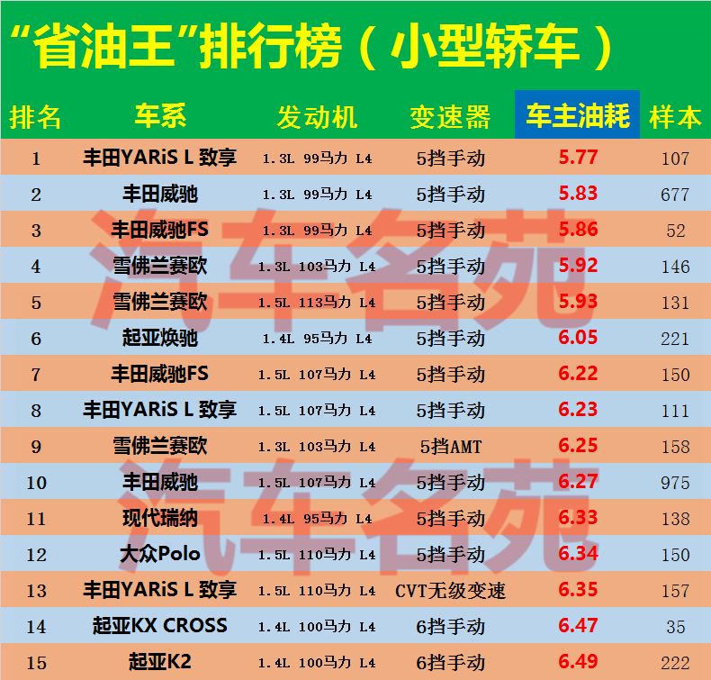 除了丰田旗下的几款小型轿车比较省油之外,雪佛兰赛欧、起亚焕驰、现代瑞纳、大众POLO和起亚K2等,开起来也比较省油。其中雪佛兰赛欧的销量还不错,1.5L排量,113的马力,比较适合城市里开,而且车型较小,停车也很方便。“最省油”轿车排名更新:英朗、朗逸前十,宝来比卡罗拉还省!