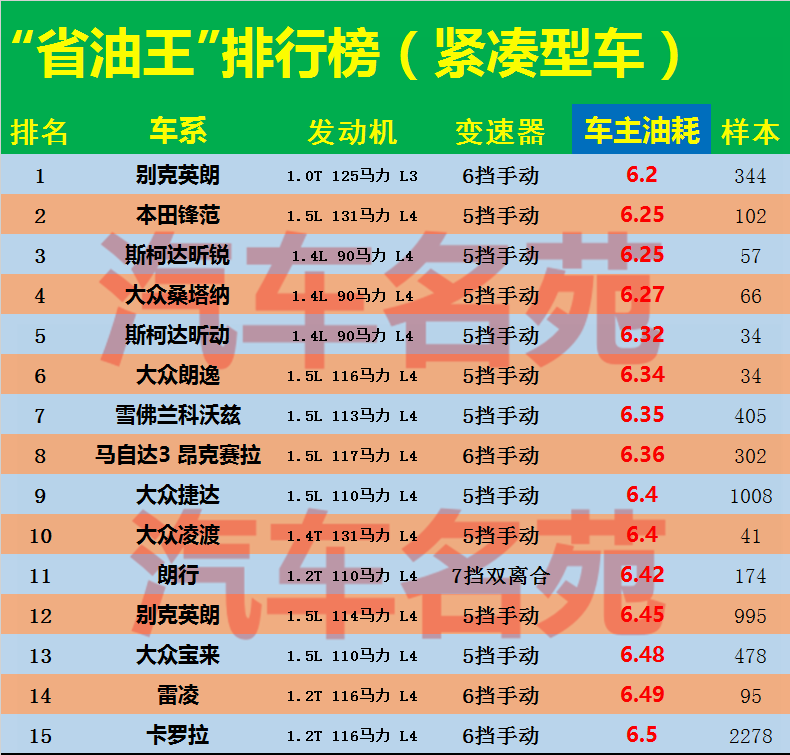 对于大多数人来说,买车主要就是为了代步,比如上班或者接送孩子,而汽车确实能给我们带来便利性,但日常养车也是一笔不小的花费,所以买车时它的经济性也是非常重要的。所以大家在选购汽车时,除了要考虑它的品质和质量外,油耗也是非常重要的。为了给大家一个好的购车推荐,本期内容就给大家分享一份最新发布的“最省油”轿车排行榜,其中小型轿车和紧凑型轿车各上榜15款,它们的油耗都是低于6.5L的,所以也被大家称为是“省油王”。“最省油”轿车排行榜更新:英朗、朗逸前十,宝来比 卡罗拉省!