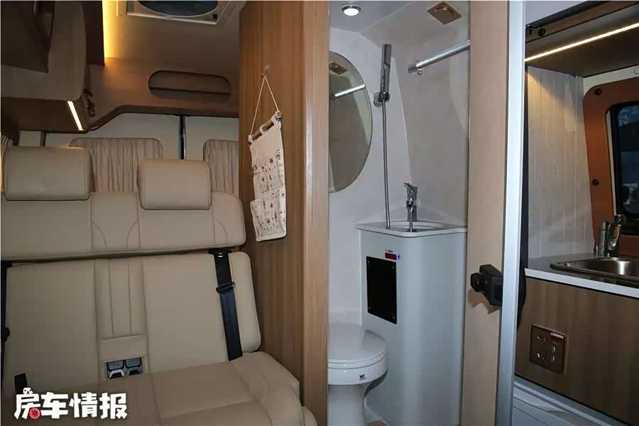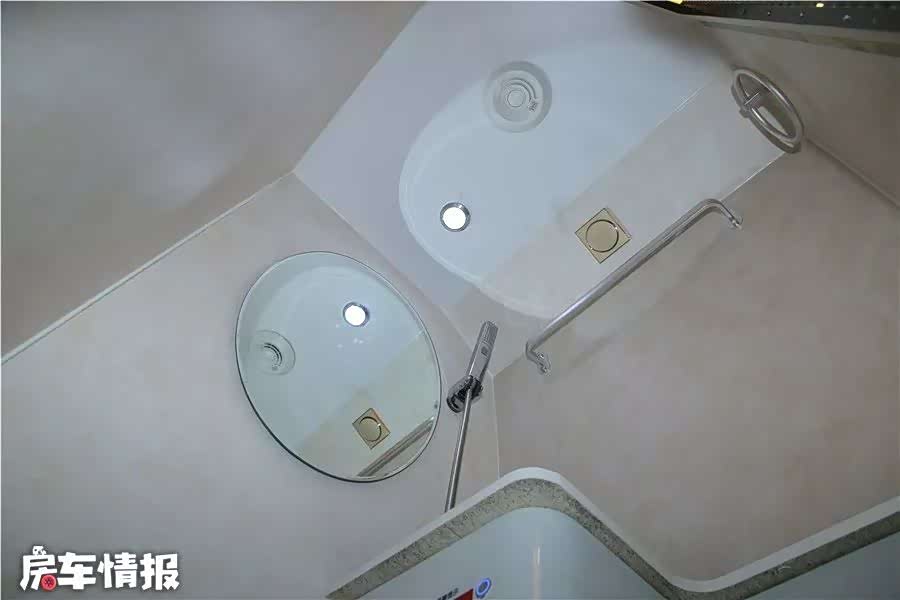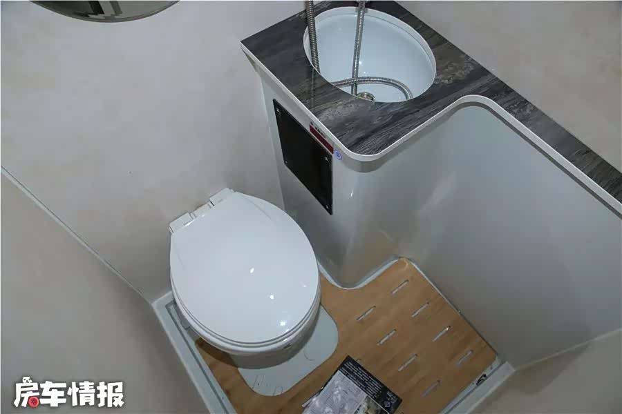 卫浴间受制于车身尺寸空间比较狭小,好在卫浴设施还是比较齐全的。标配顶置排风扇、照明灯、毛巾架、浴室镜、淋浴花洒、洗手池和粉碎式坐便器,日常使用需求基本满足。不过厨房的水槽与卫生间洗手池功能重复,如果将卫生间洗手池取消还能扩大些许空间。