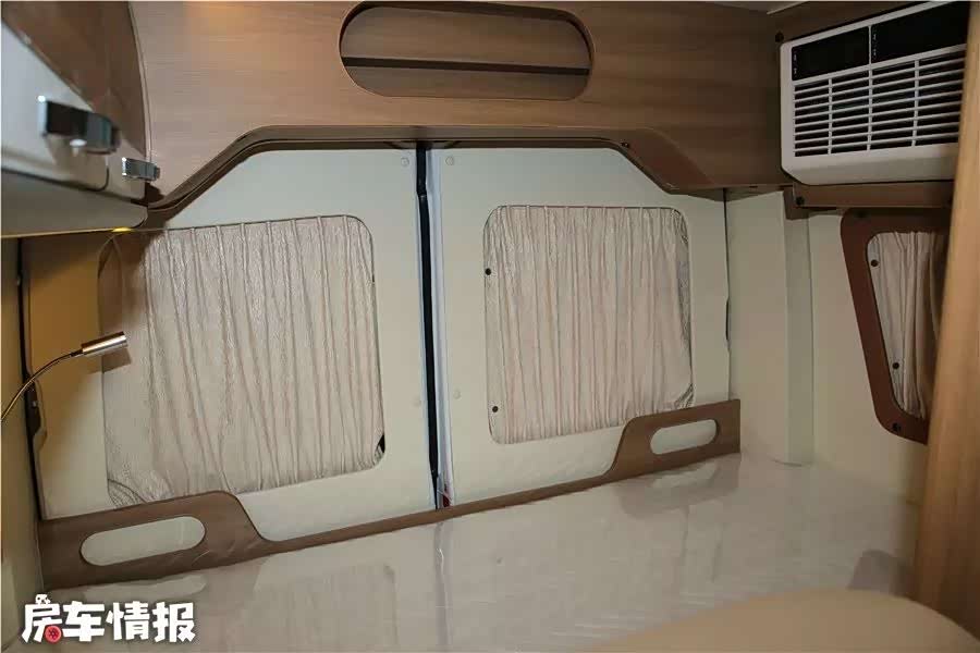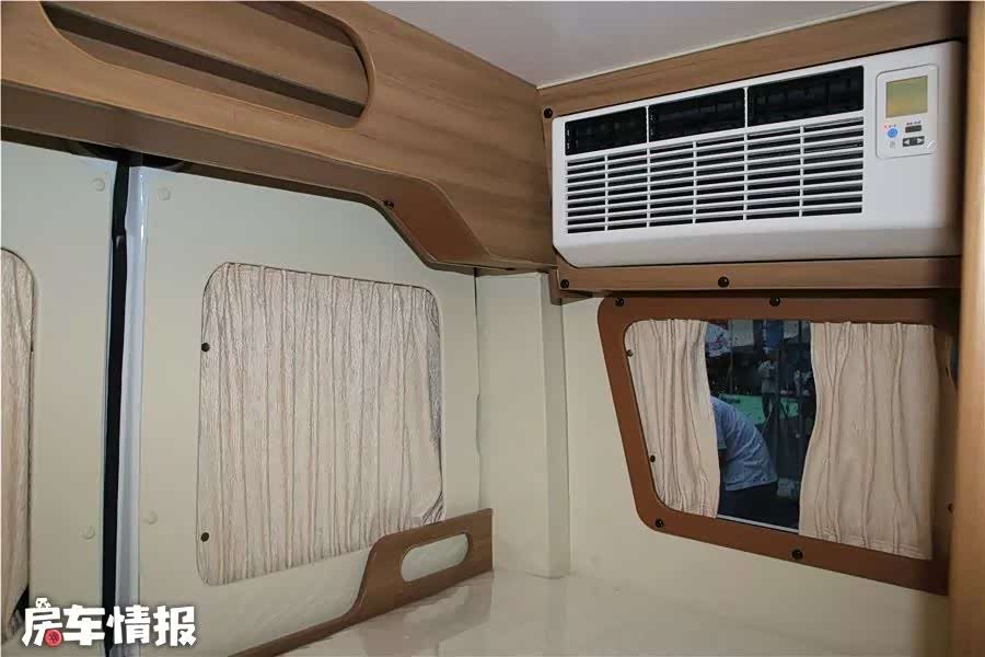 床铺顶部配有一台电动双向换气扇,不太热的天气可以充当风扇的角色。如果太热也不用担心,床尾还有一台12V直流变频空调,在不接外电的情况下可运行7-8个小时,比较节能。
