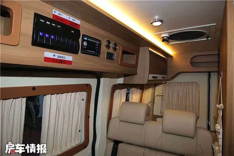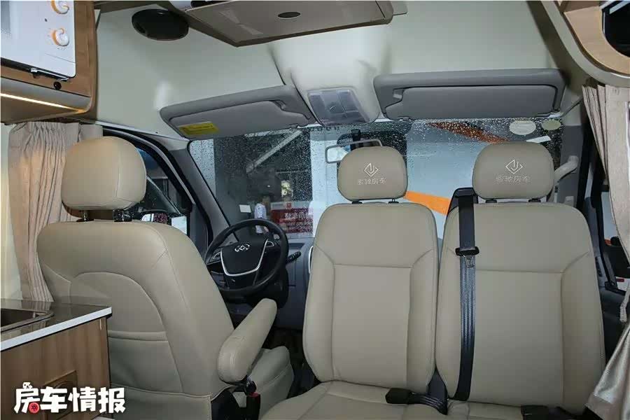 车内的座椅布局采用了3+2的形式,副驾驶的双人座椅可向后旋转,与第二排座椅组成4人对坐的会客区。驾驶区车顶配有一台19寸折叠式液晶电视和音响系统,在休闲提供不错的娱乐体验。将第二排座椅折叠后可以和前排座椅拼床,尺寸为1900*900(mm),这个床铺尺寸在车身短小的短轴B型房车内实在不多见。