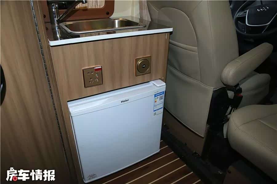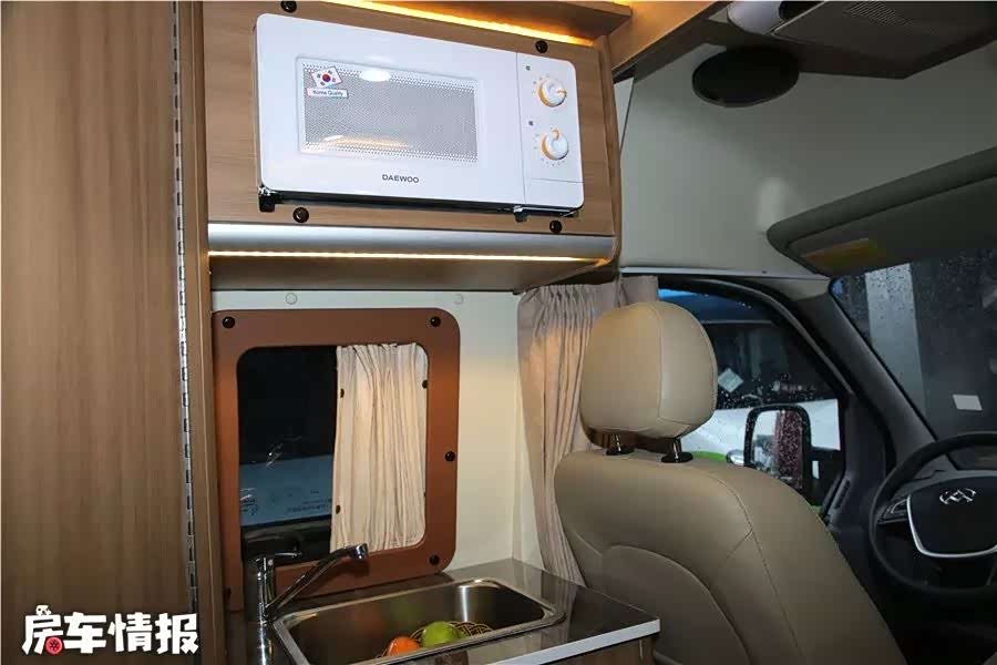 主驾驶座椅后是简易厨房和卫浴间。厨房上方吊柜选配了一台进口大宇微波炉,操作台配有水槽,下方有220V电源接口,可以接入烧水壶、的电磁炉等厨电使用。最下侧是一台12V车载冰箱,存取食品饮料比较方便。