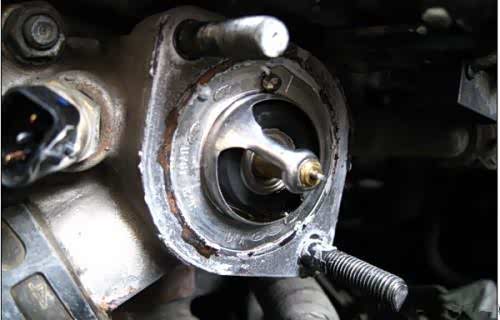 节温器控制发动机冷却液的温度,档冷却液温度低于工作温度时,发动机冷却液经旁路流回水泵进口,当发动机冷却液温度达到工作范围后,节温器打开,封闭旁路,开启大循环模式,迫使发动机冷却液流入散热器中冷却。