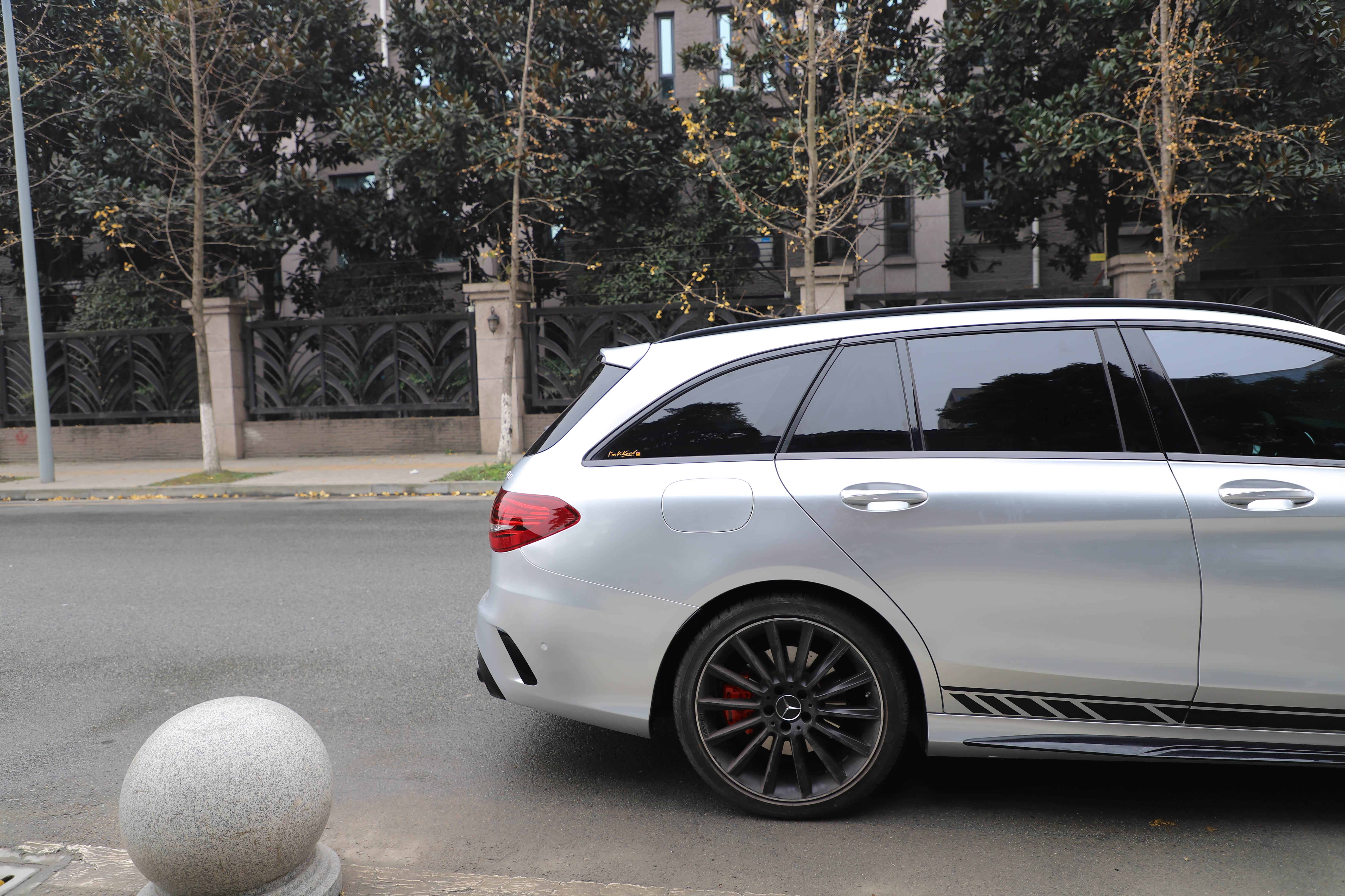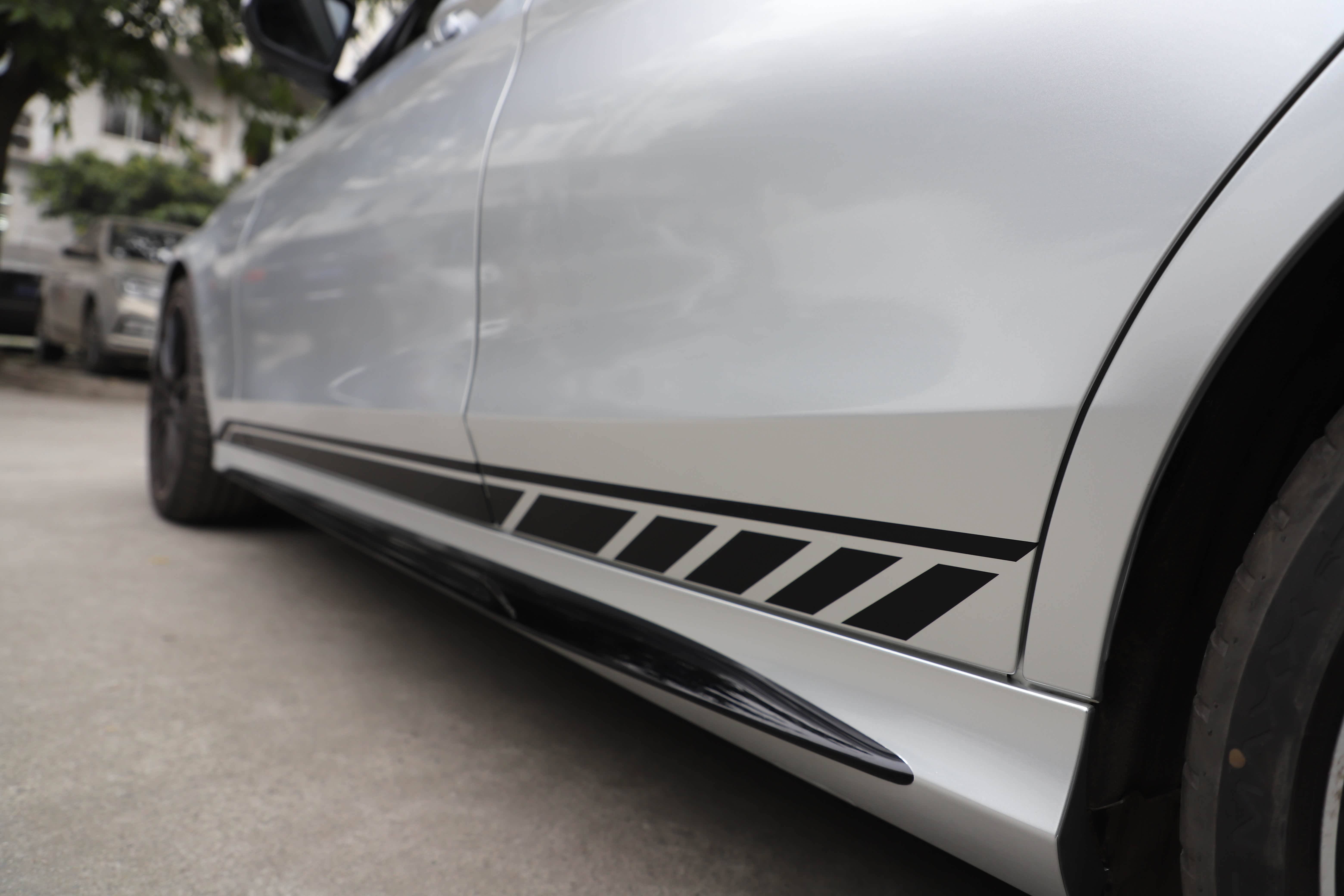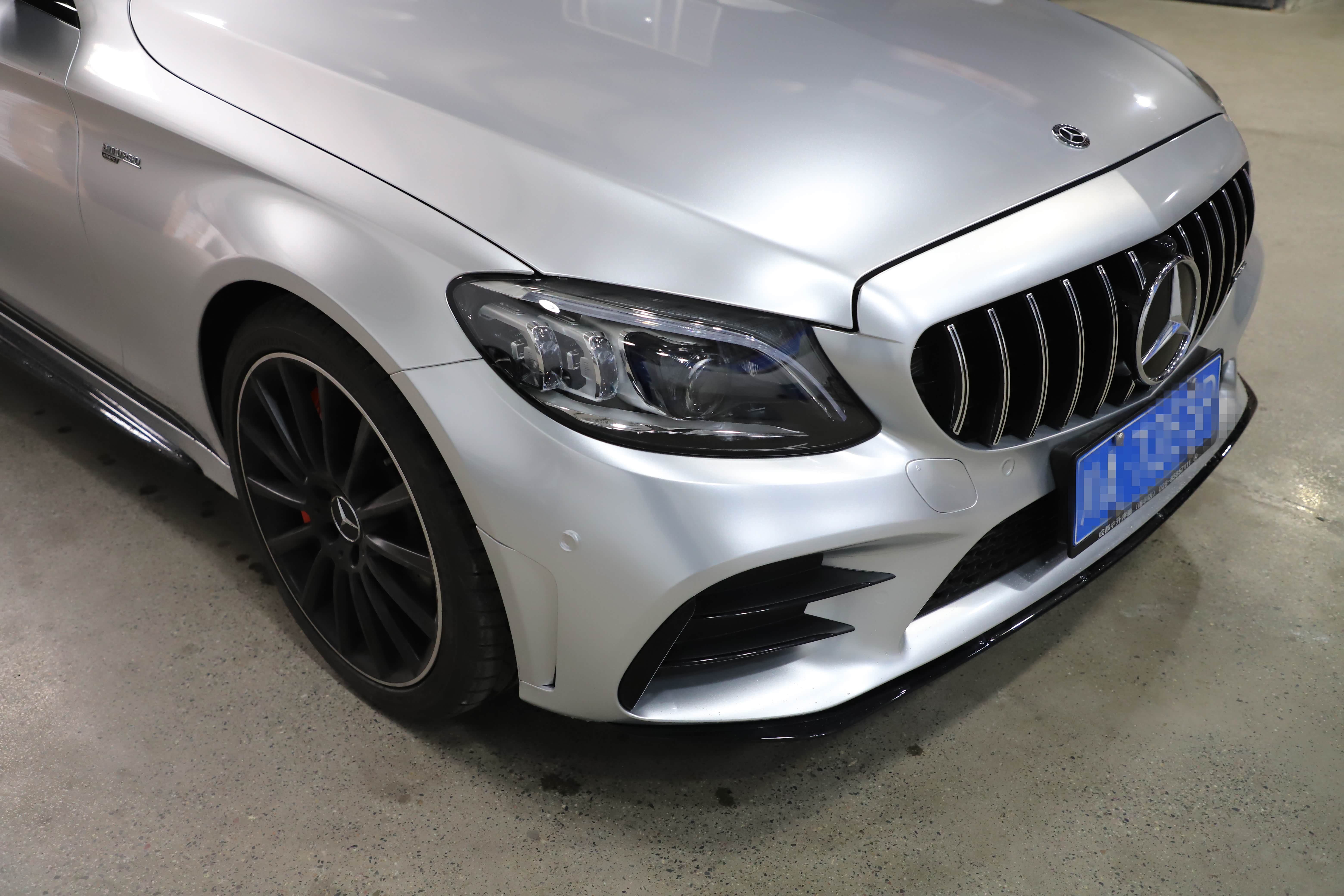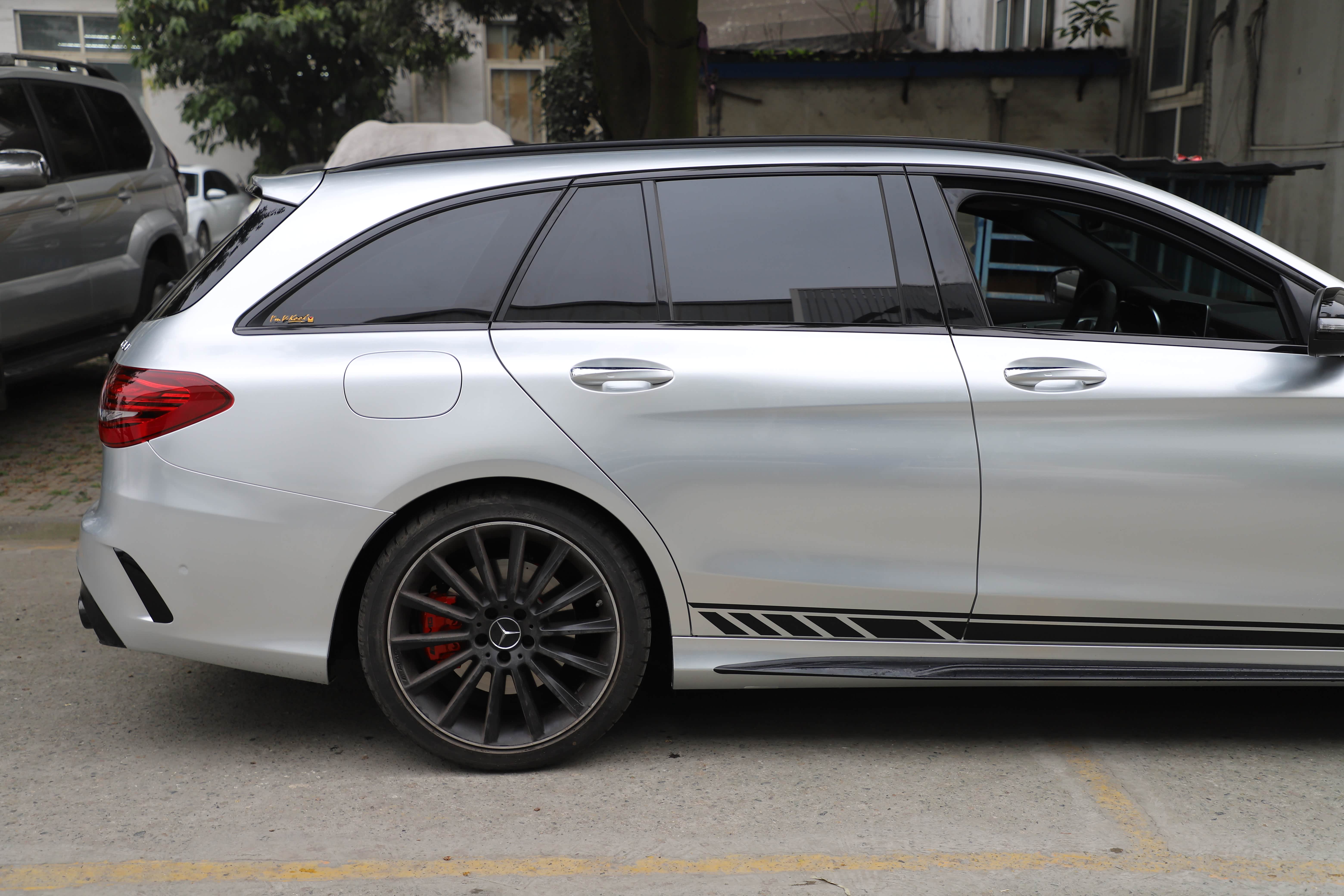 原车白色C43自带拉花,看了一次官方银色!被惊艳到了,撕掉拉花,选了最接近的银色,好像看不出来是贴膜的了,浑然一体