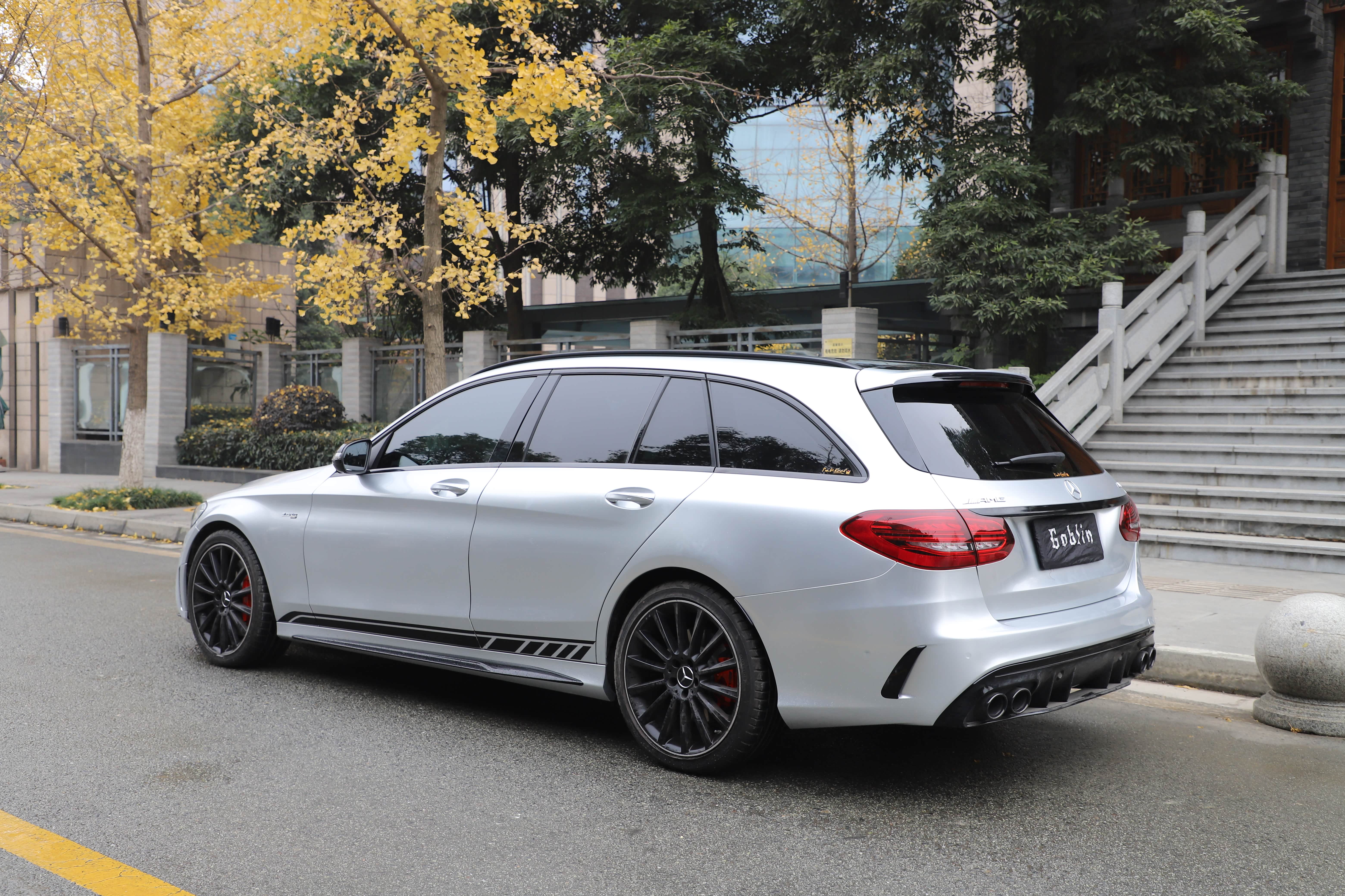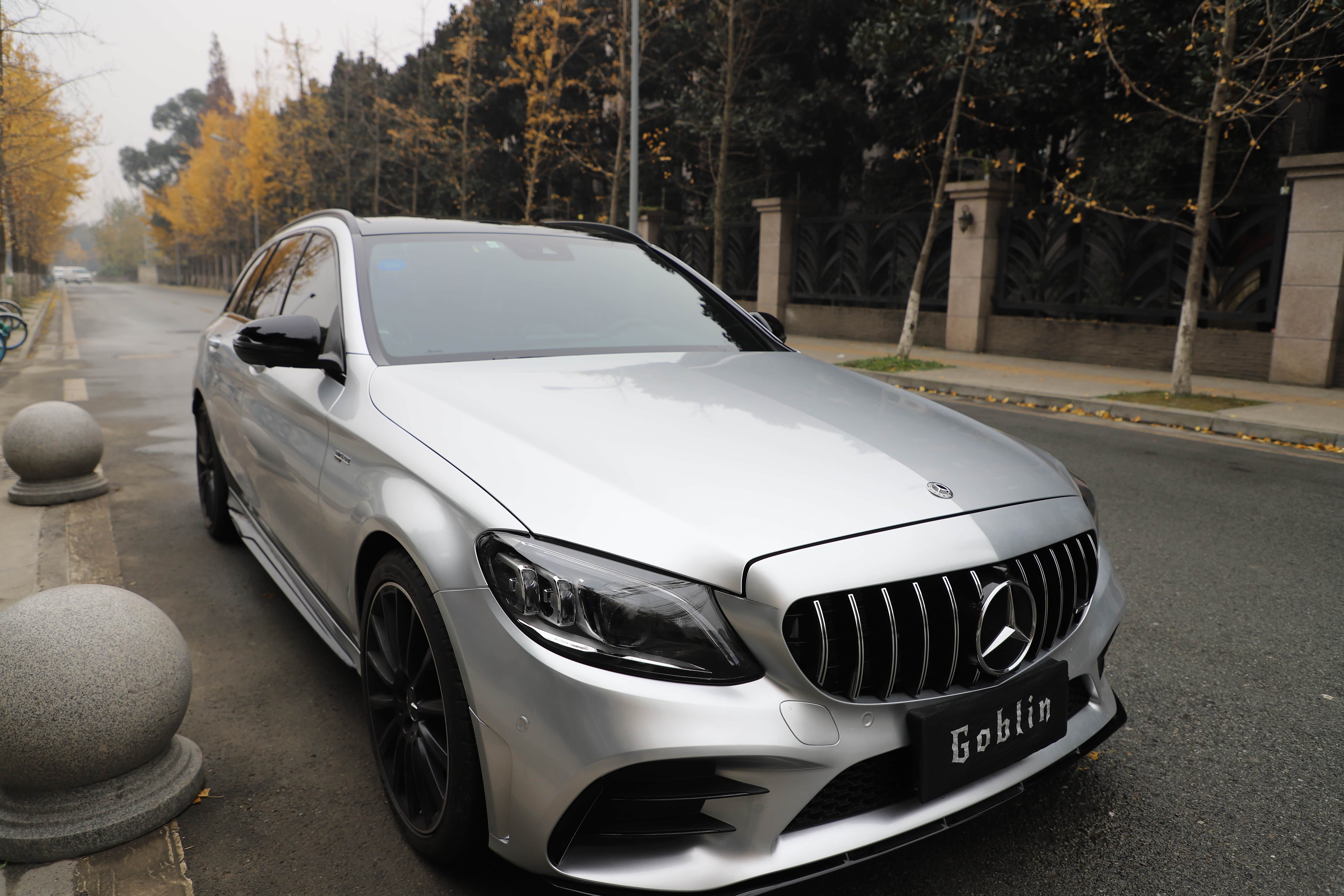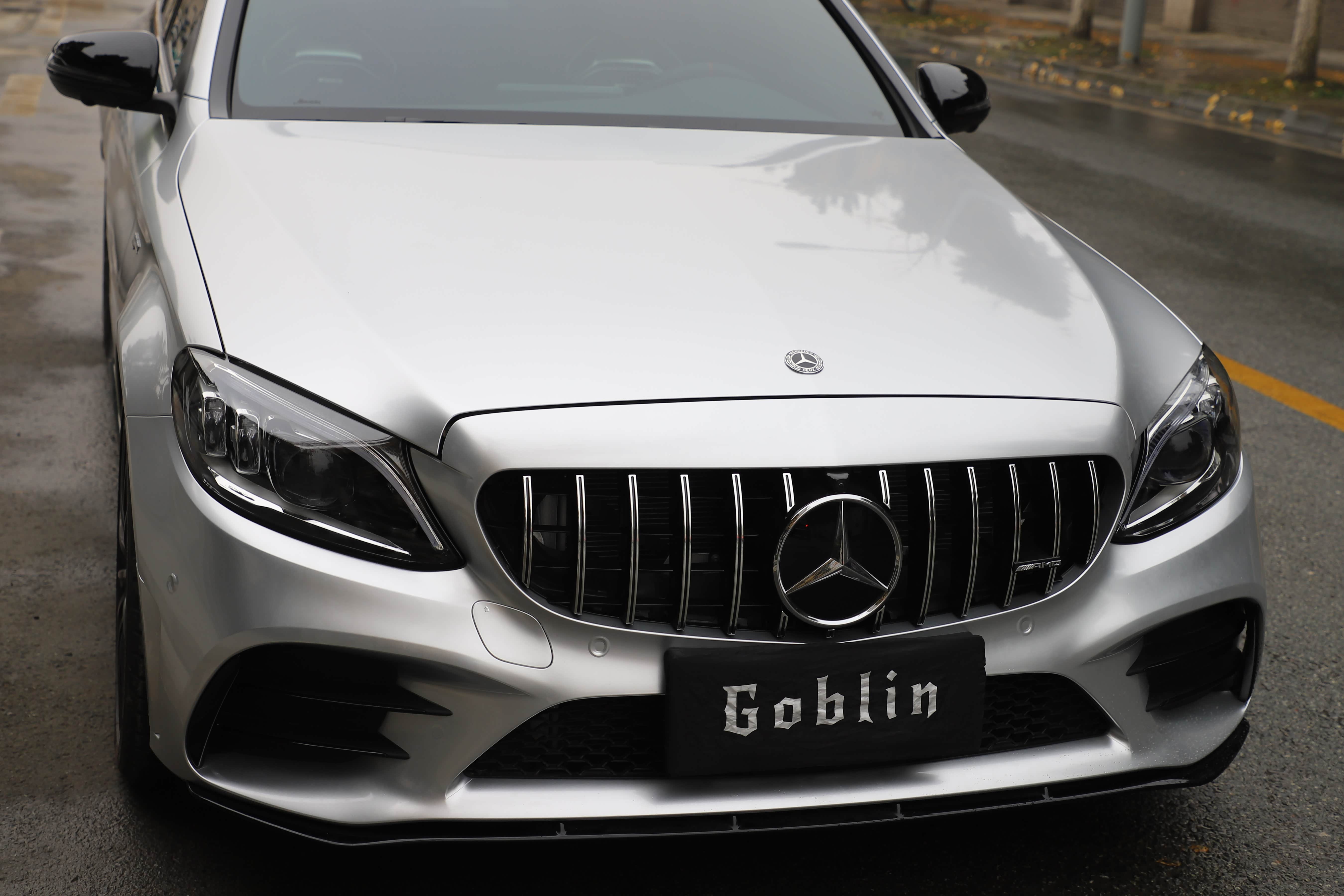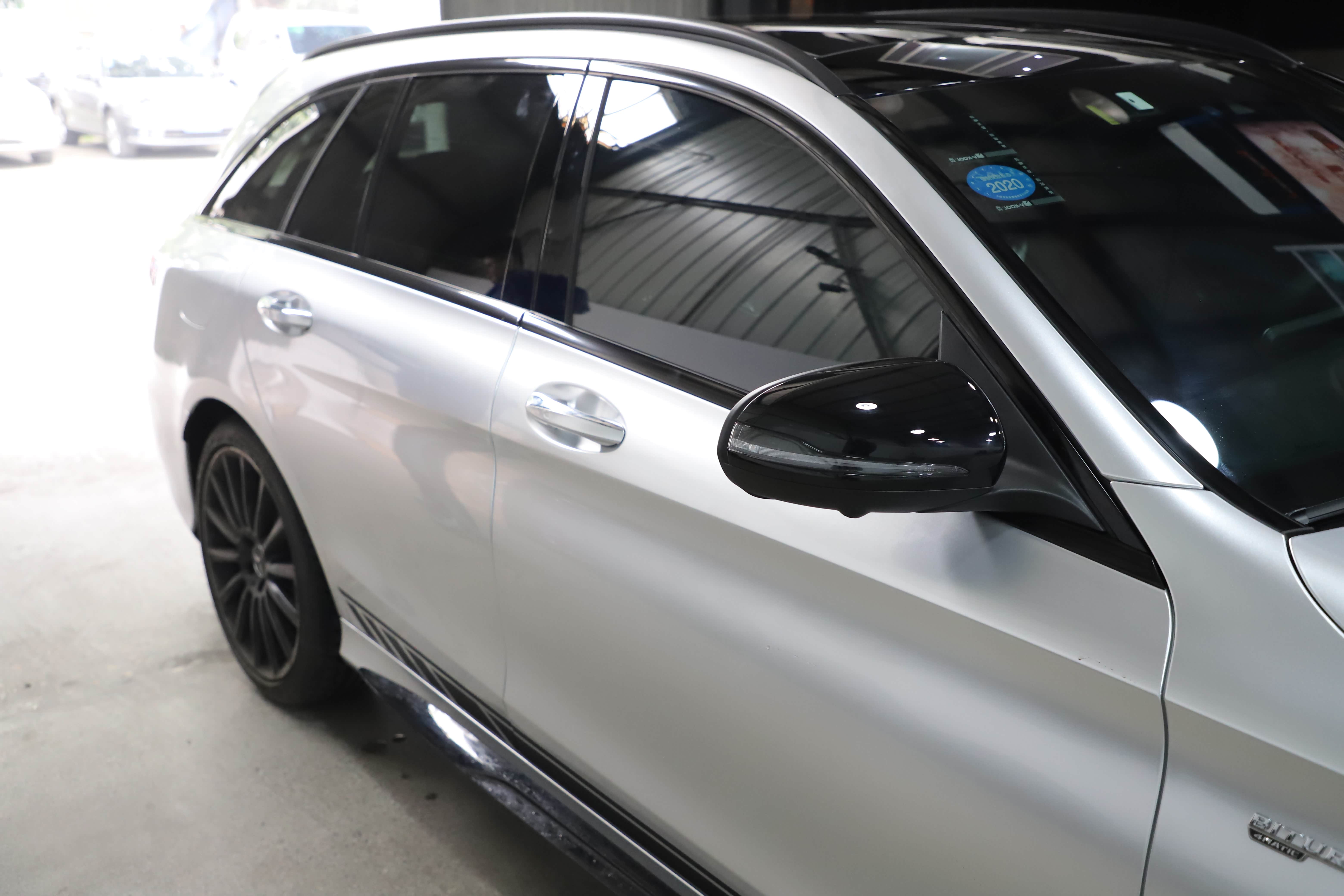 原车白色C43自带拉花,看了一次官方银色!被惊艳到了,撕掉拉花,选了最接近的银色,好像看不出来是贴膜的了,浑然一体
