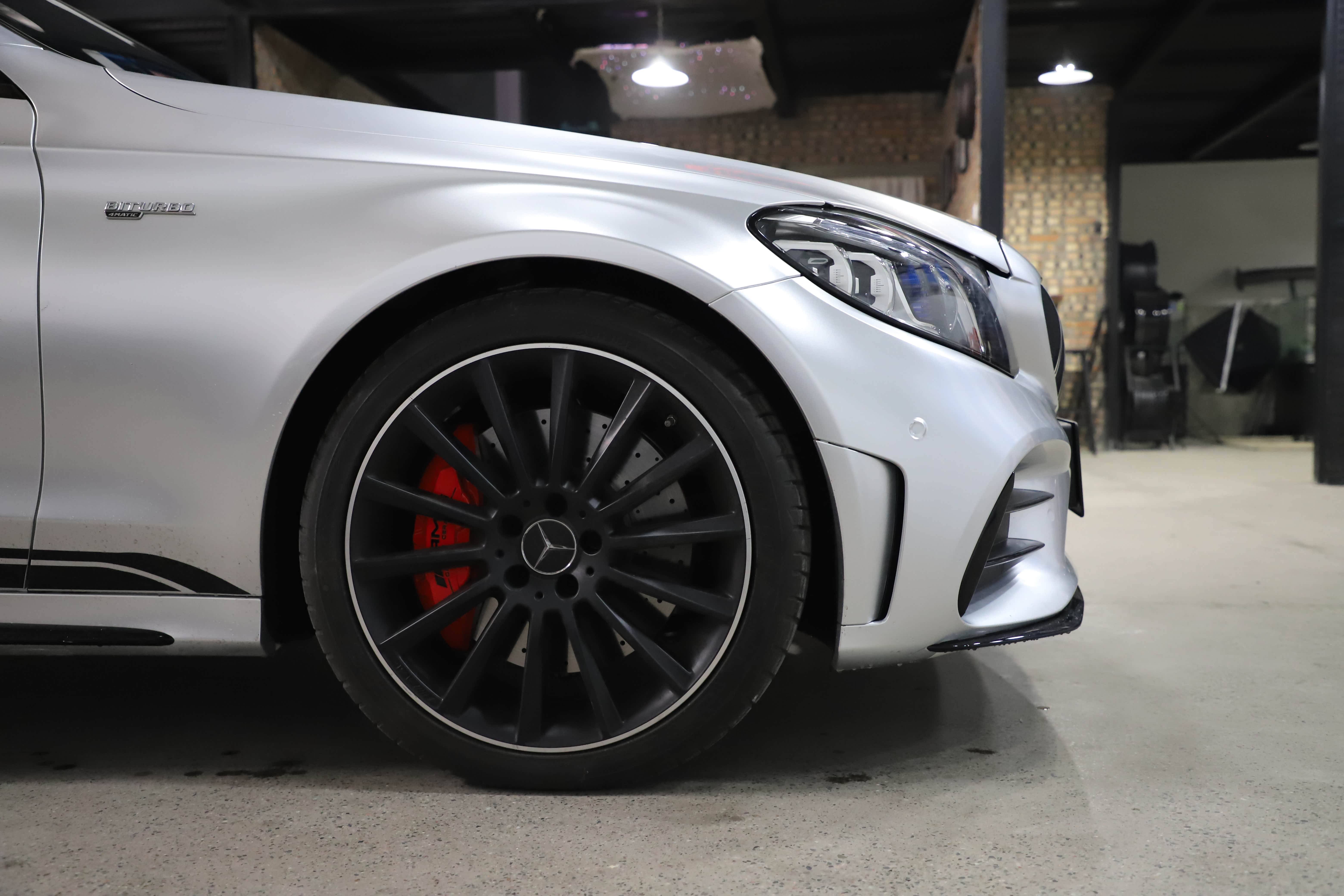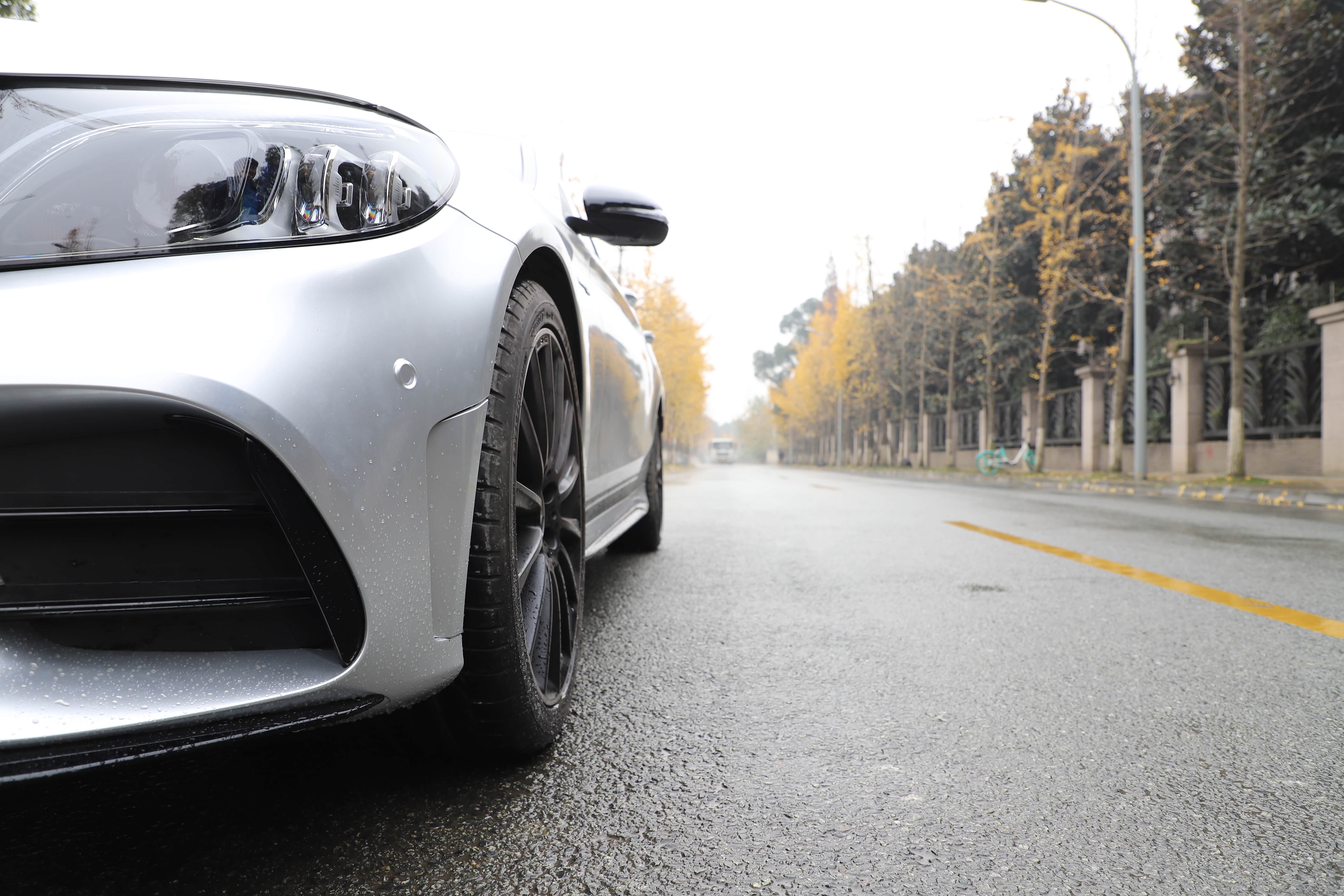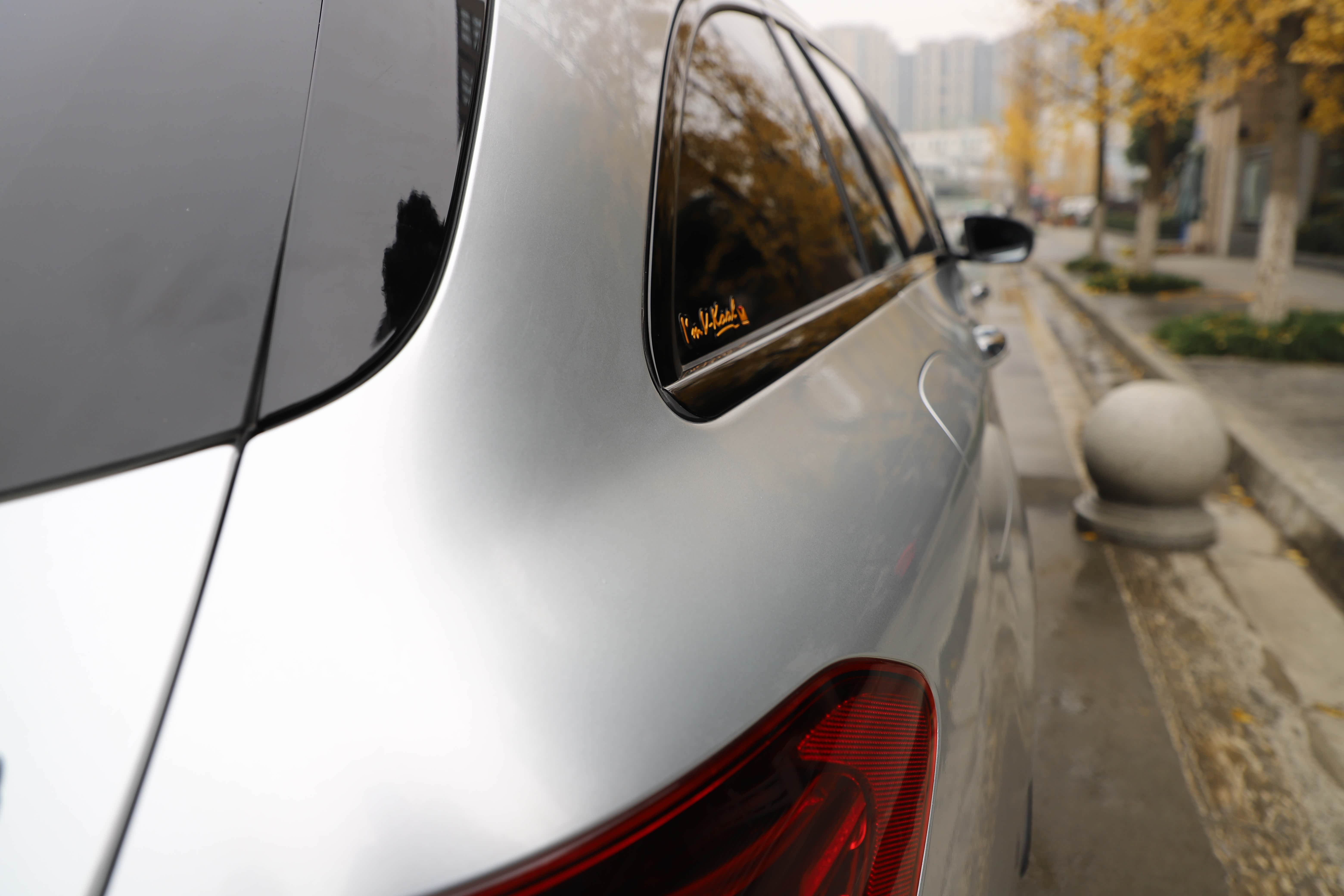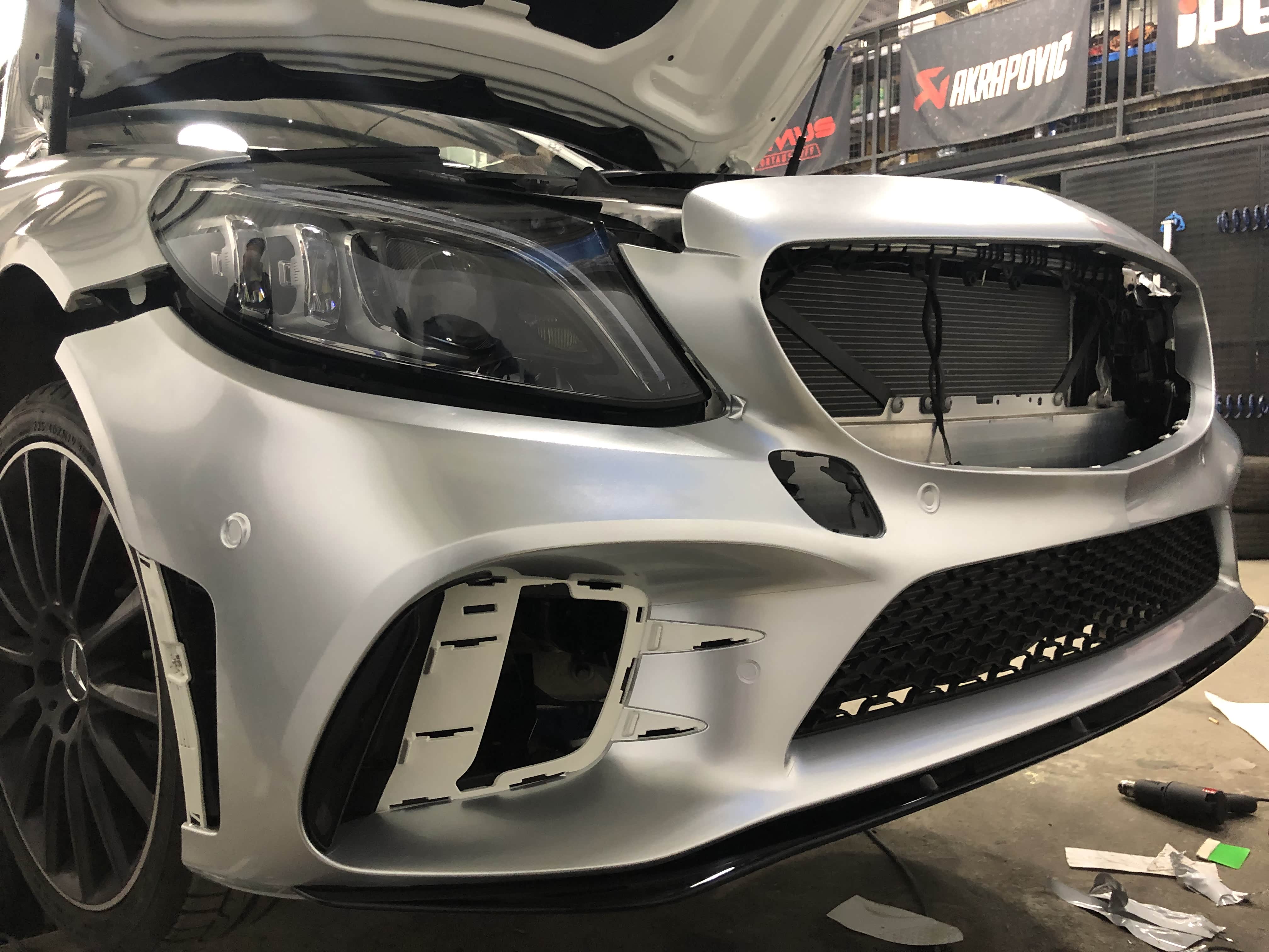 原车白色C43自带拉花,看了一次官方银色!被惊艳到了,撕掉拉花,选了最接近的银色,好像看不出来是贴膜的了,浑然一体