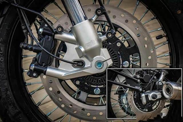 在车辆的配置方面,这款车的油箱采用卡扣式设计,容积为13.5升,结合发动机排量来说,续航里程可以达到300km左右。车轮的搭配也是采用复古车比较经典的设计,前后采用辐条轮,外加腾森龟背轮胎,看起来气质十足,同时也具有很强的抓地力。