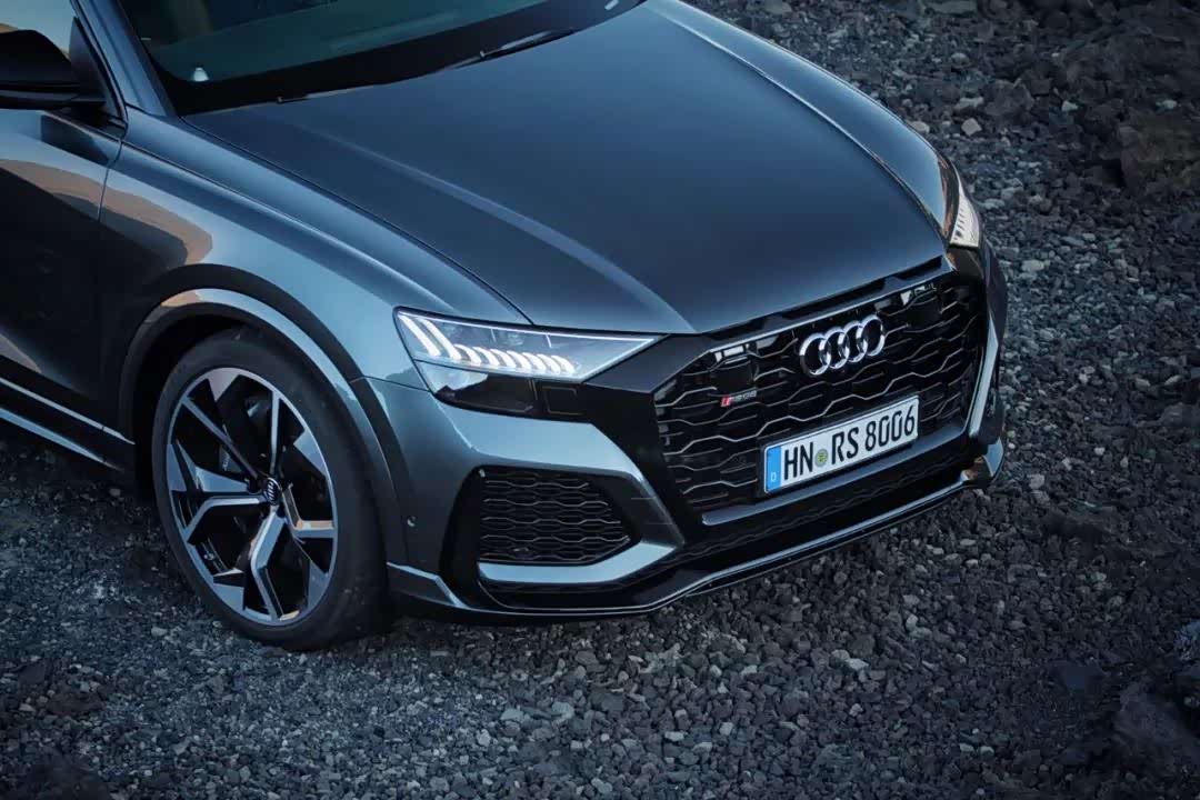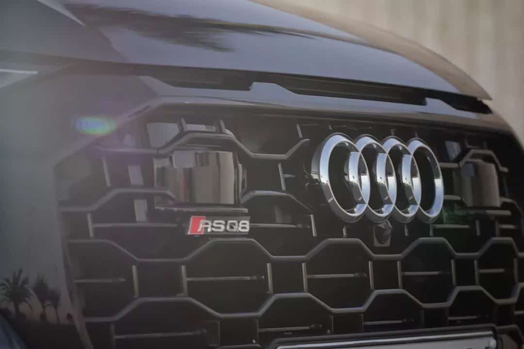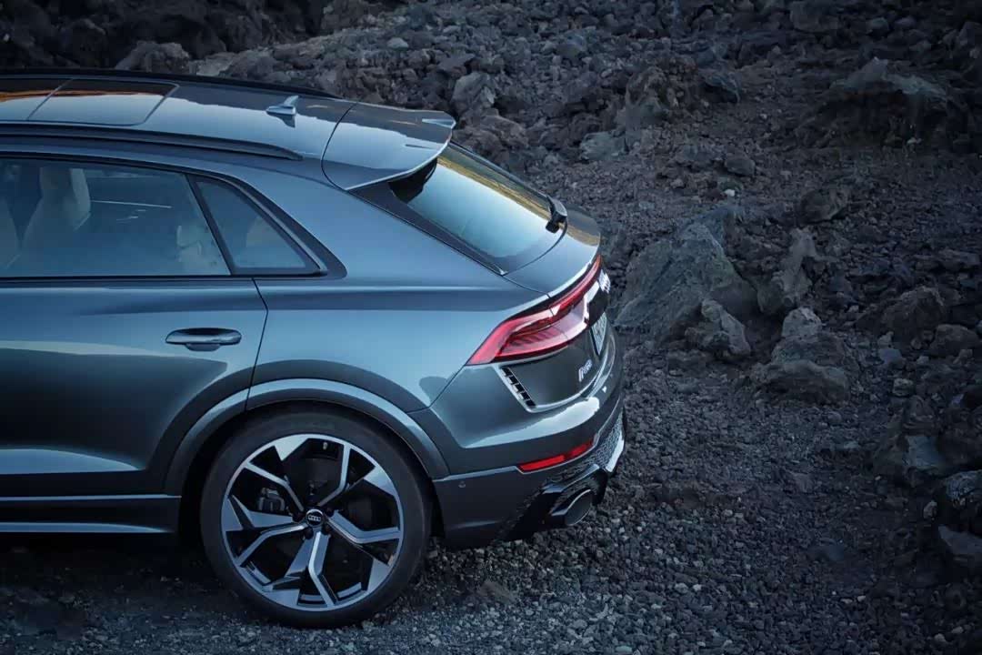 奥迪RS Q8的外观造型基本保留了Q8的比例,只不过安装了奥迪RS风格的运动化套件,但是有很多细节不同,比如离地间隙,毕竟Q8的基础车型相比之下更加注重通过能力,而对于RS Q8来说需要进一步降低车身,因为后者需要更快的速度。更低的姿态让RS Q8的姿态更加稳健,对于车来说,一低遮百丑,本来就帅的车,会更帅。不但低,还要宽,这套运动套件相比基础车型车身前端加宽了10mm,尾部加宽了5mm,更低,更宽,这姿态势必会咄咄逼人,车顶的扰流板是RS专属,而且这个扰流板并不是摆设,它提供的下压力重心刚好位于后轴上方,这会显著提升高速行驶时的车身稳定性。这次RS Q8为我们提供了一套熏黑风格的外观套件,有多黑?就连奥迪的四个圈儿都是黑色的,当我第一次看到停在路边的RS Q8时就被这种酷黑到底的风格吸引了,传统的亮色奥迪LOGO看起来更高级,而熏黑前脸则让这辆车像戴了一副黑色面具一样,杀气腾腾。