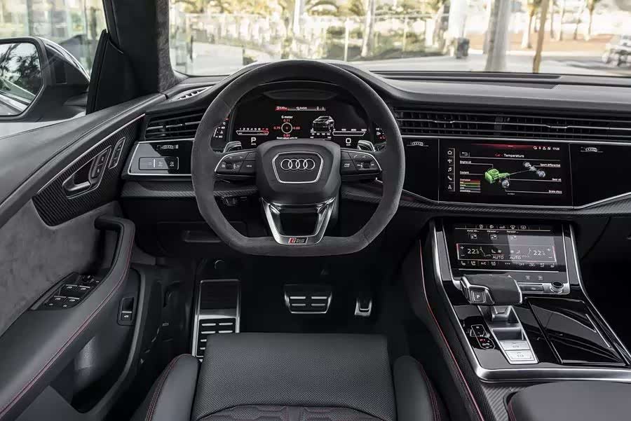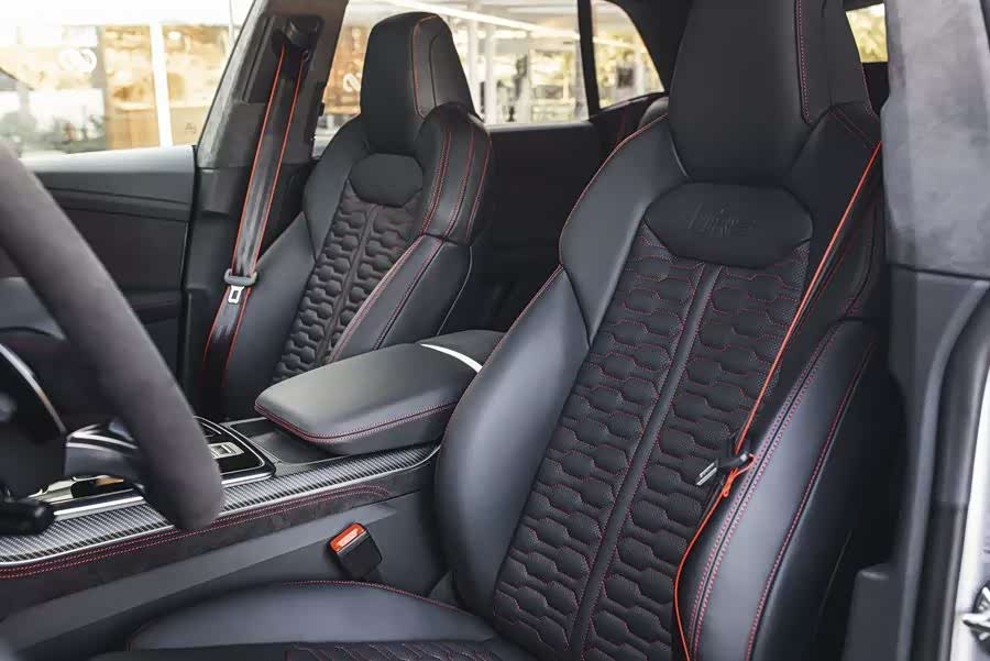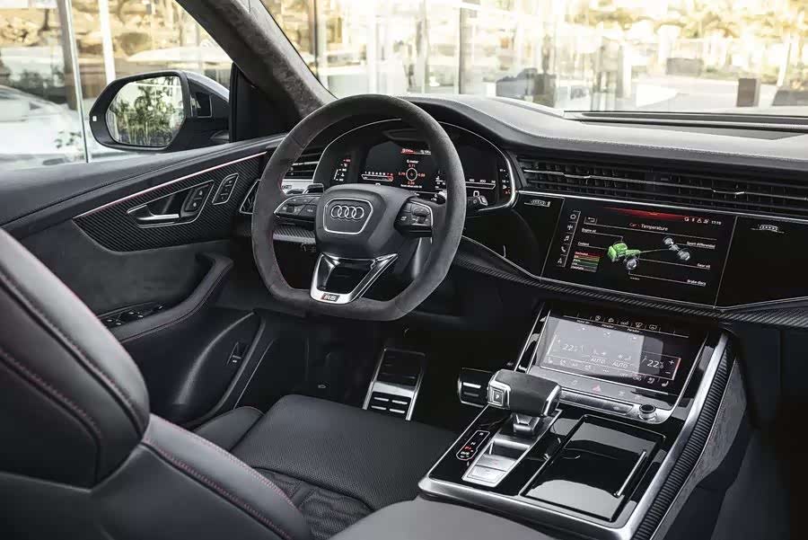 RS Q8的车内还是我们所熟知的奥迪冰冷科技风格,甚至和Q8没有太大的区别,但是Alcantara材料的使用消除了车内的高光反射,该有的战斗氛围还是有的,此外更为高级的装饰面板材料可以选装碳纤维、天然灰棕木、哑光铝也和普通版本的Q8有效区分开,虚拟驾驶舱的RS显示器和多媒体交互终端可以显示胎压、扭矩、功率、油温、单圈时间、G值,换挡提示灯也非常好玩,这是超跑的标准装备,抬头显示也可以选装为RS专属的,总之该不一样的地方,终究会不一样的。