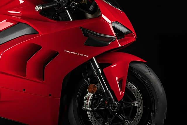 而不同于前两款,V4R则是绝对杜卡迪对于赛车的体现,它也更接近于真正的赛车,可以说它是一款符合公路法律的WSBK级别的赛车。并且由Ducati Corse 设计,在空气动力学上独树一帜。动力上虽然还是1103cc的V4发动机,但强调低转牵引力,以达到最佳的动力传递效率,因为在设计的时候考虑了赛道,所以内部组件有更高的进气效率。在15250转可以达到221马力动力输出,比普通版V4高出了2250转。离合器用了干式离合器,全套的空气动力学组件,具有特殊形状的通风孔,碳纤维机翼可提高稳定性,减少电子控制干预。悬架上用了全新的欧林斯电子悬架,但可机械调整,型号上就是加压板的NPX 25/30,后减震则是TTX36。