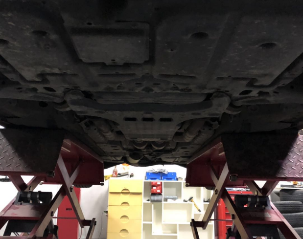 最后在合作修理厂进行底盘检测,可以看到整个底盘没有大面积托底的情况,各个护板齐全,虽然这辆车有些年份,但不得不说这车身底部看起来确实很OK。