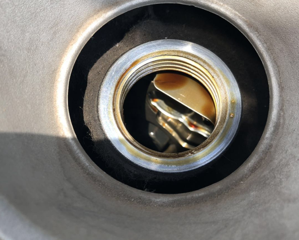 通过机油加注口往发动机内部看,各个部件表面光滑,没有油泥积碳堆积,感觉就跟新的一样,防冻液和刹车油可能也是刚更换不久,基本没有异常情况。机舱内检测完成,发动机气门室盖和缸垫轻微渗油,整体情况还是很不错的。