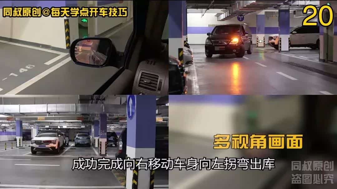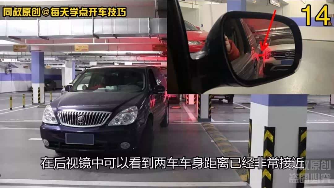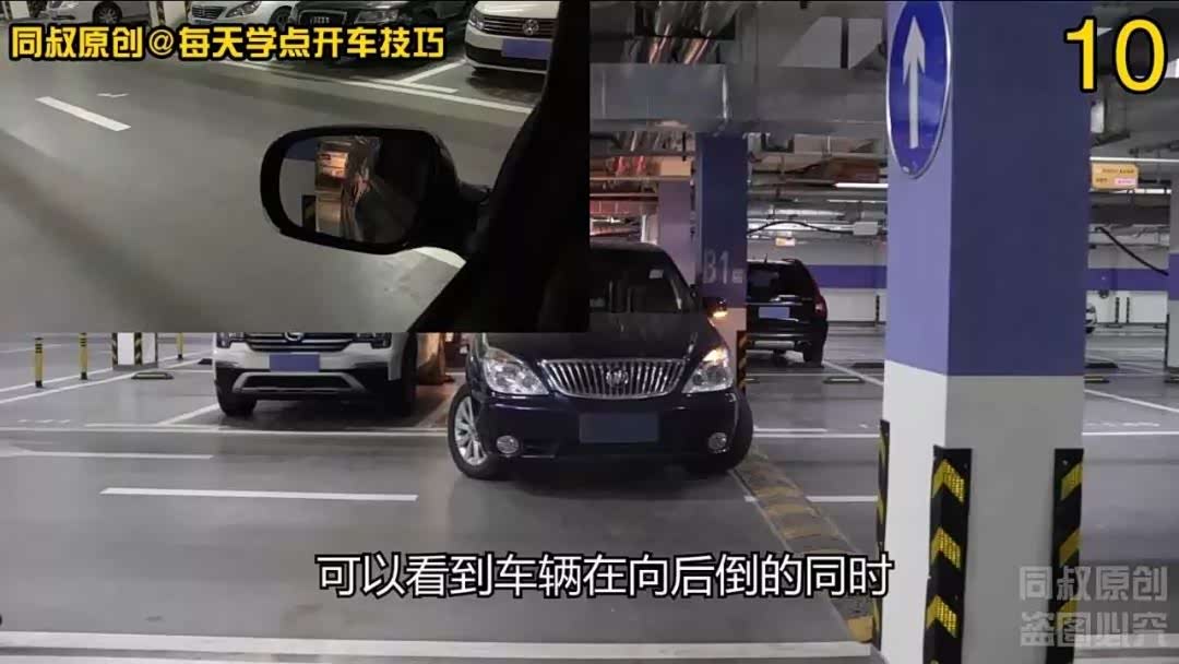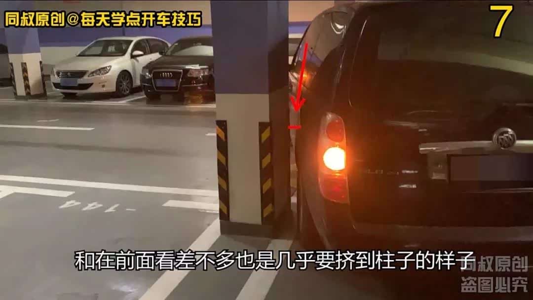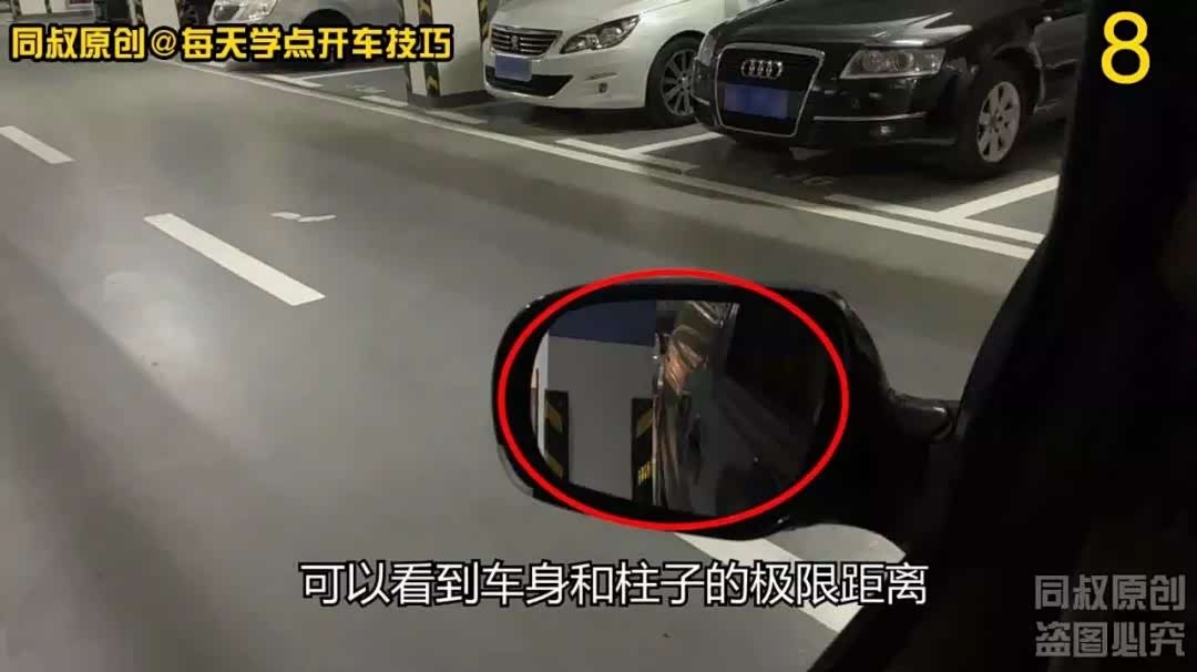 注意观察左后视镜车身与柱子的距离,好的这次距离安全,