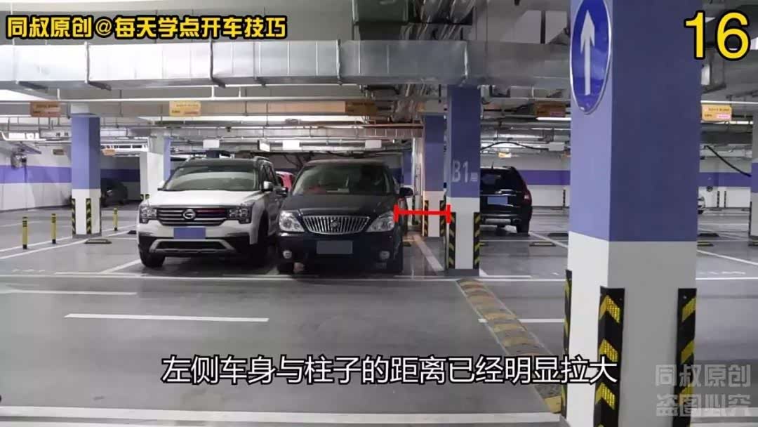 现在车辆又回到了车位,但是车身已经靠向了右侧,左侧车身与柱子的距离已经明显拉大。