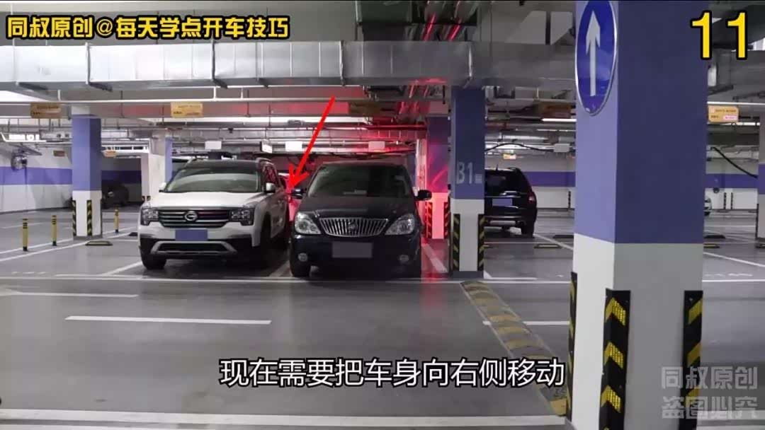 现在需要把车身向右侧移动,让左侧车身与柱子距离拉大,然后再向左拐出库的时候车身就不容易挤到柱子了,
