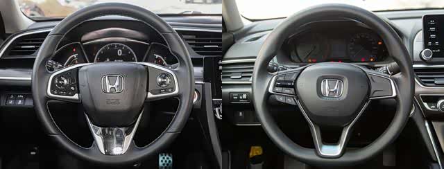 两款车的方向盘造型大体相当,但思域是真皮材质,而雅阁则是塑料,不过考虑到大多数人后期都得上套,所以也就不必太过纠结。在功能性方面,低配雅阁明显有所减配,所以和顶配思域确实没法比。