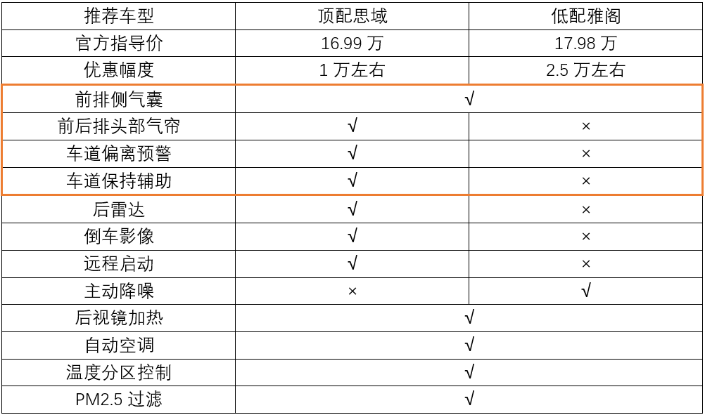 这么大的配置差距其实早在预料之中,虽然思域的安全配置也不算高,但是雅阁没有后排头部气帘这点有些遗憾,相信大家在最近比较火的汽车碰撞测试视频中,也能明体会到气囊的作用。而其它的主动安全配置上,其实也就主动刹车系统比较有用,但是两车都没配备。