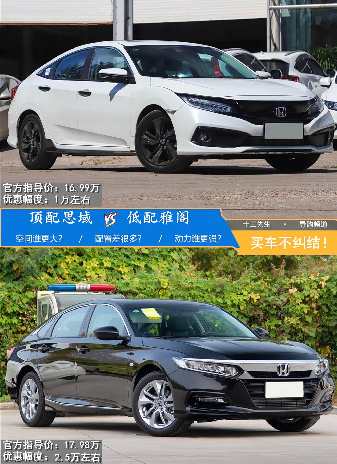 当然这个例子有些极端,这个决定背后牵扯的太多太多,纠结是在所难免。不过选车其实也不容易,选对一辆车不仅仅就是买了一台好车而已,它对你的人生轨迹或多或少也会产生影响。不过这是后话,文章结尾会再跟大家详细聊聊。这两款车选择的分别是2019款 220TURBO CVT燃擎版 思域和2018款 230TURBO版雅阁,它们在优惠后的价格基本相当,都在15-16万元之间。这两款车在它们各自级别中的销量都很高,口碑和保值率等方面也都不错,选择起来确实不易。