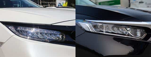 两款车的大灯都采用了本田最新的羽翼式设计,但由于高低配车型的原因,雅阁的远光灯为卤素光源,而思域则全是LED。而且思域还比雅阁多了自动头灯和大灯延时关闭功能。